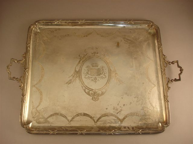 GRAND PLATEAU DE SERVICE de forme rectangulaire en métal argenté, à fond gravé d'une frise de laurier et au centre d'armoiries d'alliance surmontées d'une couronne comtale. Aile ornée de filets de perles enrubannées, agrémentée de feuilles d'acanthe aux angles.