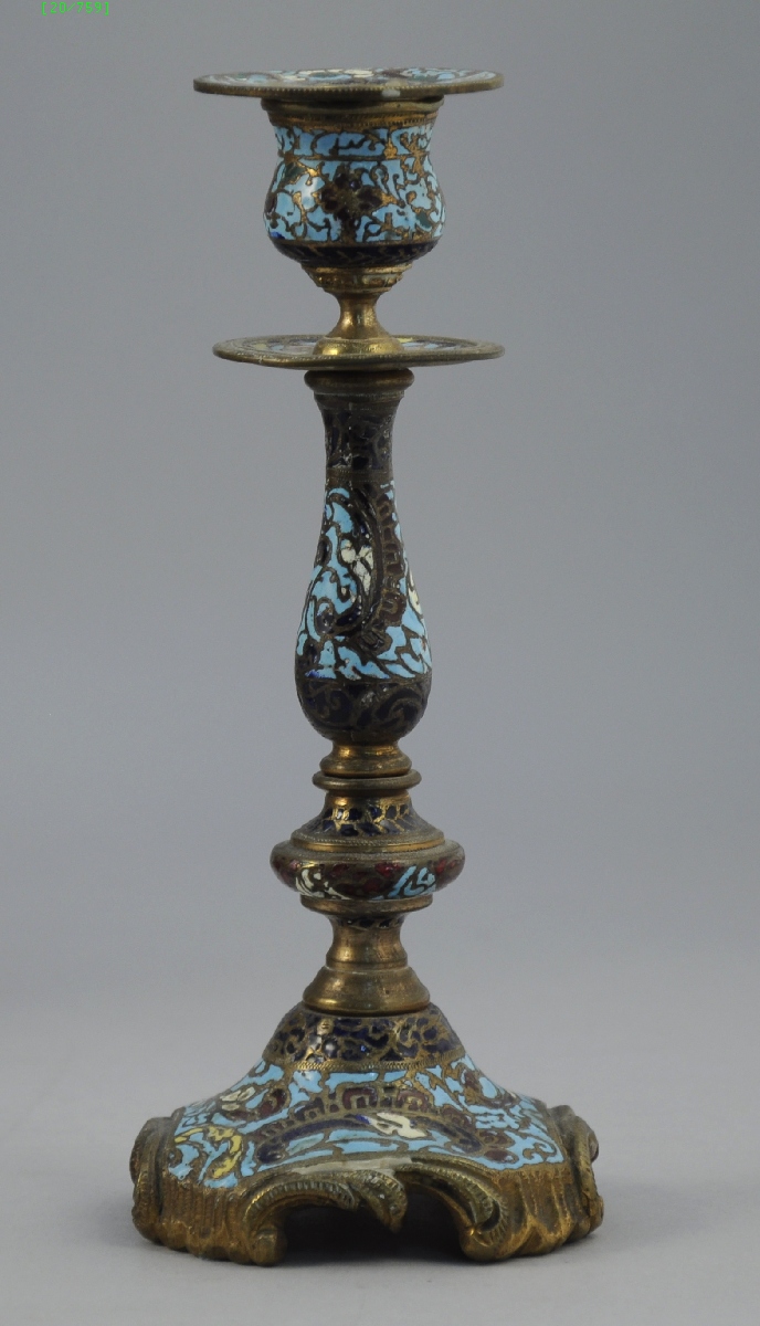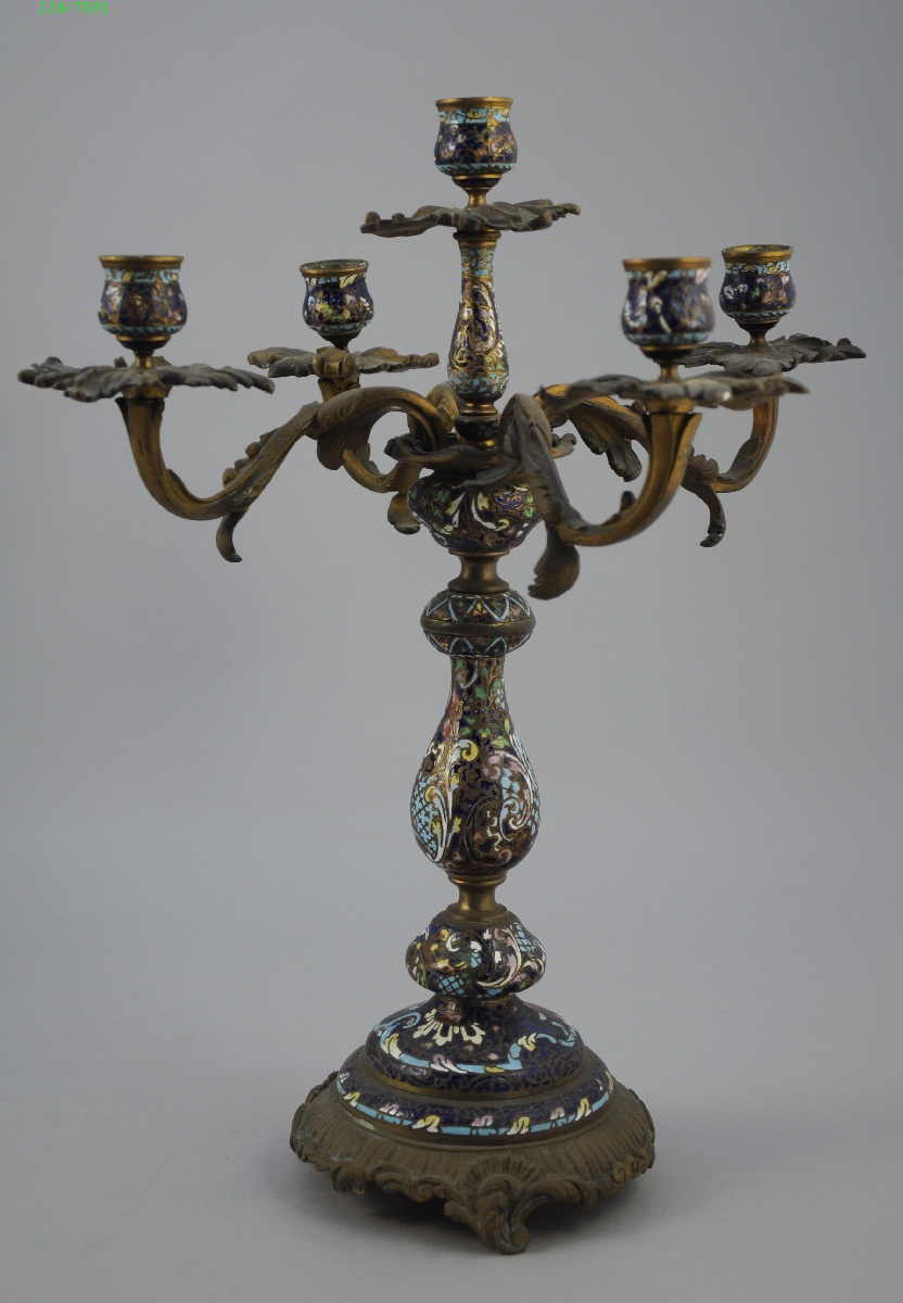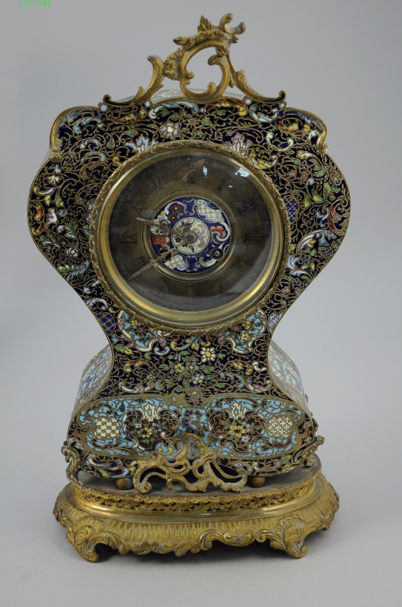 GARNITURE DE CHEMINÉE, comprenant six pièces: une pendule, deux candélabres, deux chandeliers et un pied de lampe. Décor floral d'esprit rocaille en émaux cloisonnés. La pendule de forme violonnée, à cadran de bronze indiquant les heures en chiffres romains, protégé par une vitre bombée. Elle repose sur une terrasse en bronze doré, à décor de coquilles et de palmes. Les candélabres à cinq lumières.