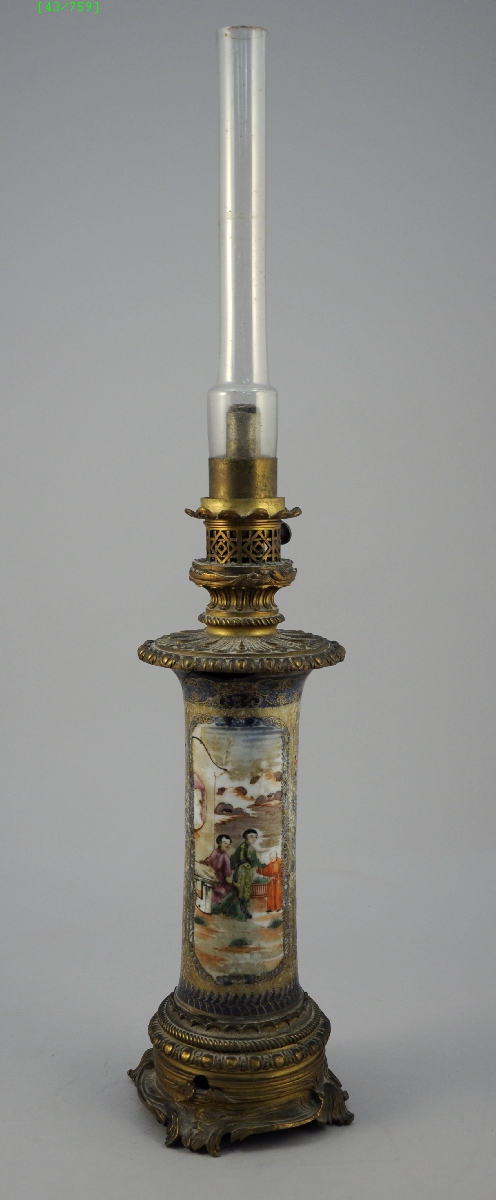 LAMPE À PÉTROLE. Fût en porcelaine chinoise à décor de scènes animées dans des paysages, sur fond d'entrelacs dorés et de fleurs rouges et bleues. Monture de bronze doré de style rocaille. Avec verre ancien.