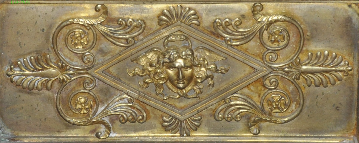 Paire de CHENETS en bronze ciselé. Décorés au centre d'un masque de Méduse dans un losange, entouré de palmettes. Montants ornés de torches et surmontés de sphères.