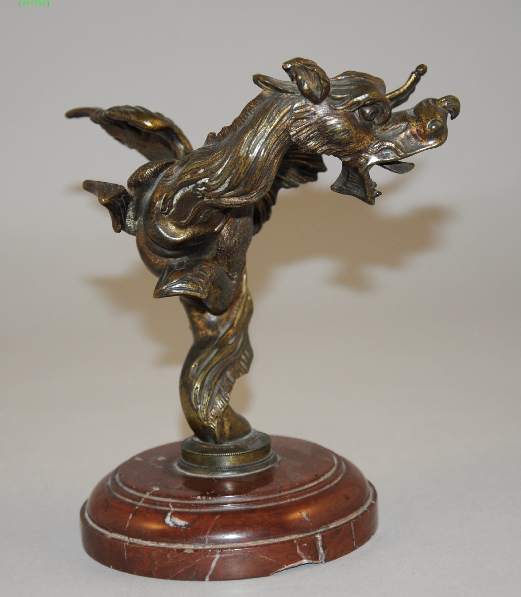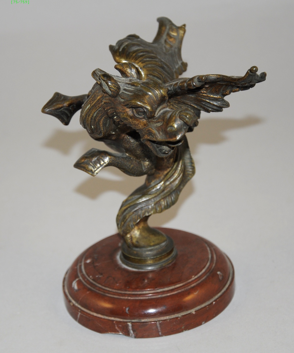 CHIMÈRE en bronze patiné. Socle circulaire à bordure moulurée en marbre rouge du Nord.