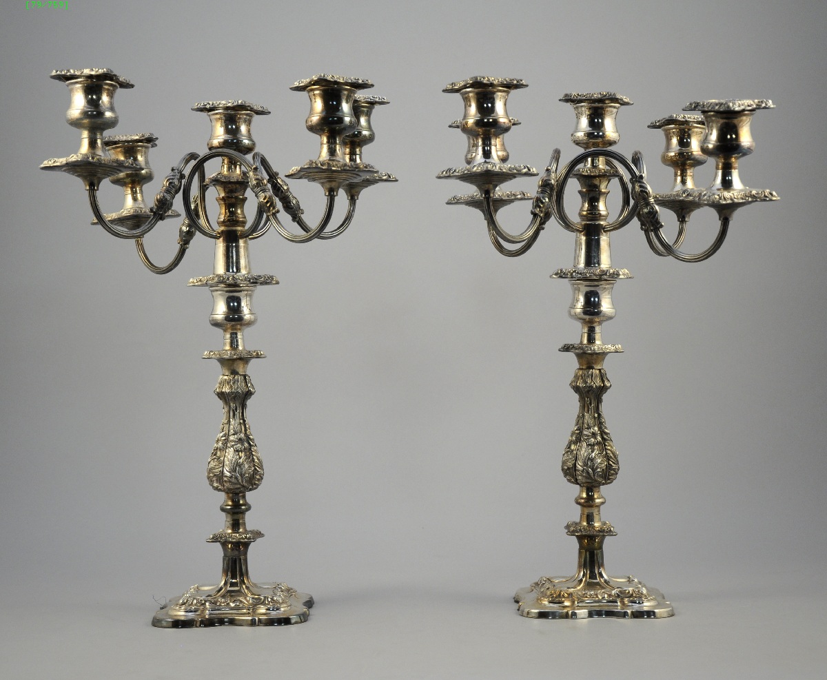 PAIRE de CANDÉLABRES à cinq lumières en métal argenté. Décor floral.