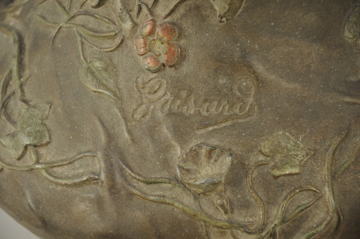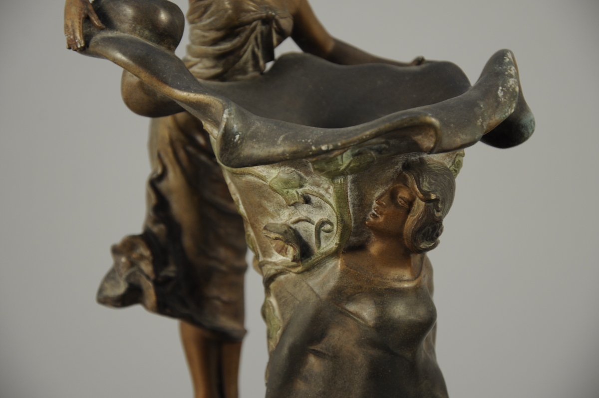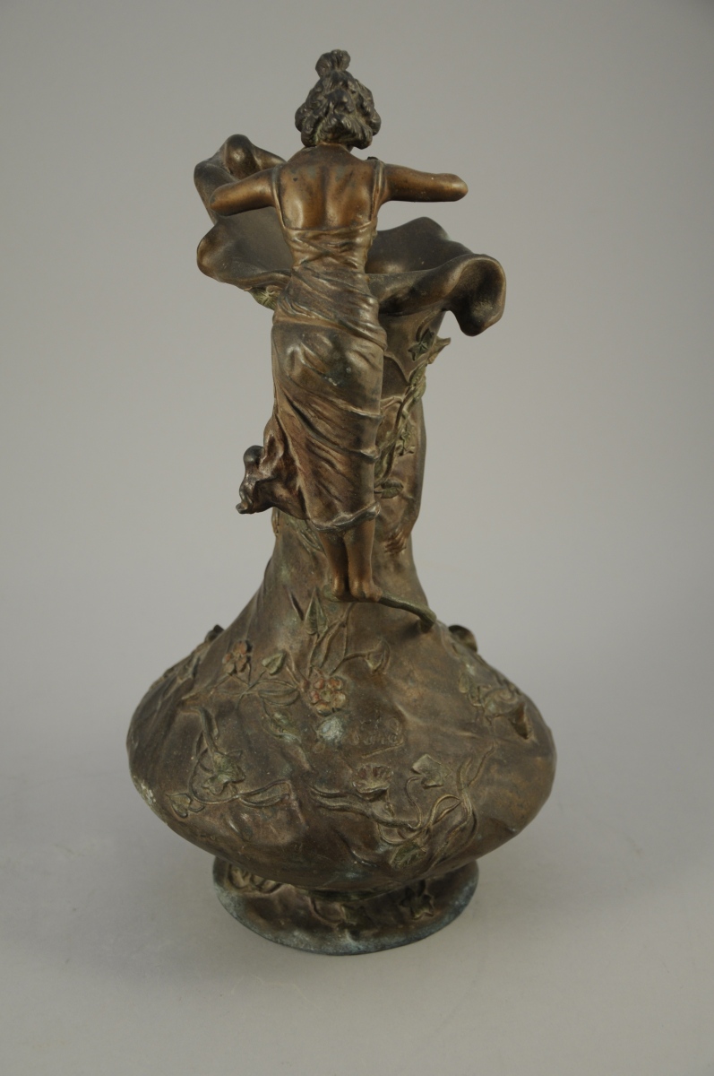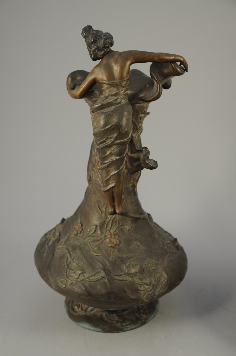GRISARD (XIXe - XXe). Paire de VASES en forme d'aiguières en régule, à patine brune, verte et rouge. Cols ornés de jeunes filles émergeant de tiges fleuries. Anses figurant des femmes en robe à plissés tourbillonnants, semblant regarder l'eau à l'intérieur des vases. Signés Grisard sous les anses.