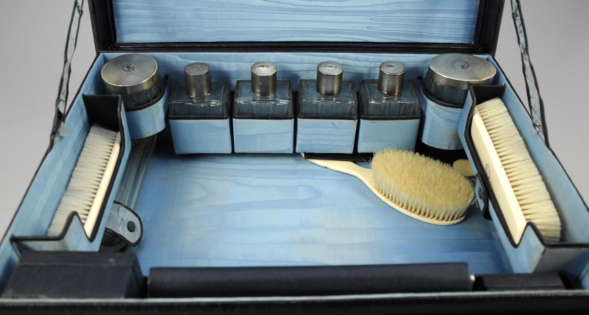 NÉCESSAIRE DE TOILETTE dans sa valise gainée de cuir noir et garnie de moire bleue. Il comprend: