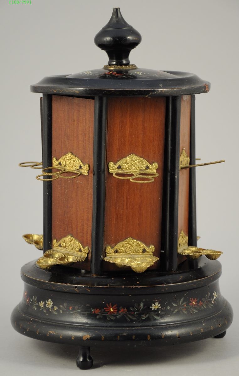 CAVE À CIGARES en forme de kiosque en bois noirci, et peint de merveilleuses et d'incroyables, ainsi que de fleurettes. La prise supérieure permet l'ouverture des différentes portes garnies de présentoirs à cigares en métal doré.
