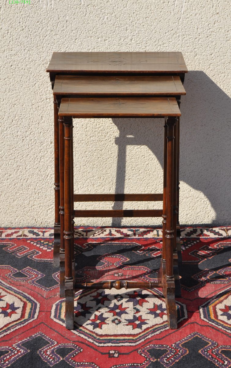 TROIS TABLES GIGOGNES en bois tourné. Les plateaux à décor gravé d'un motif floral en losange. Elles reposent sur des pieds patins.