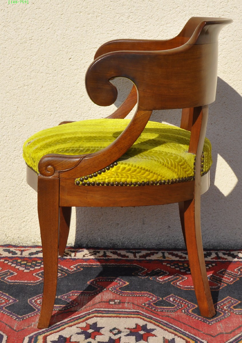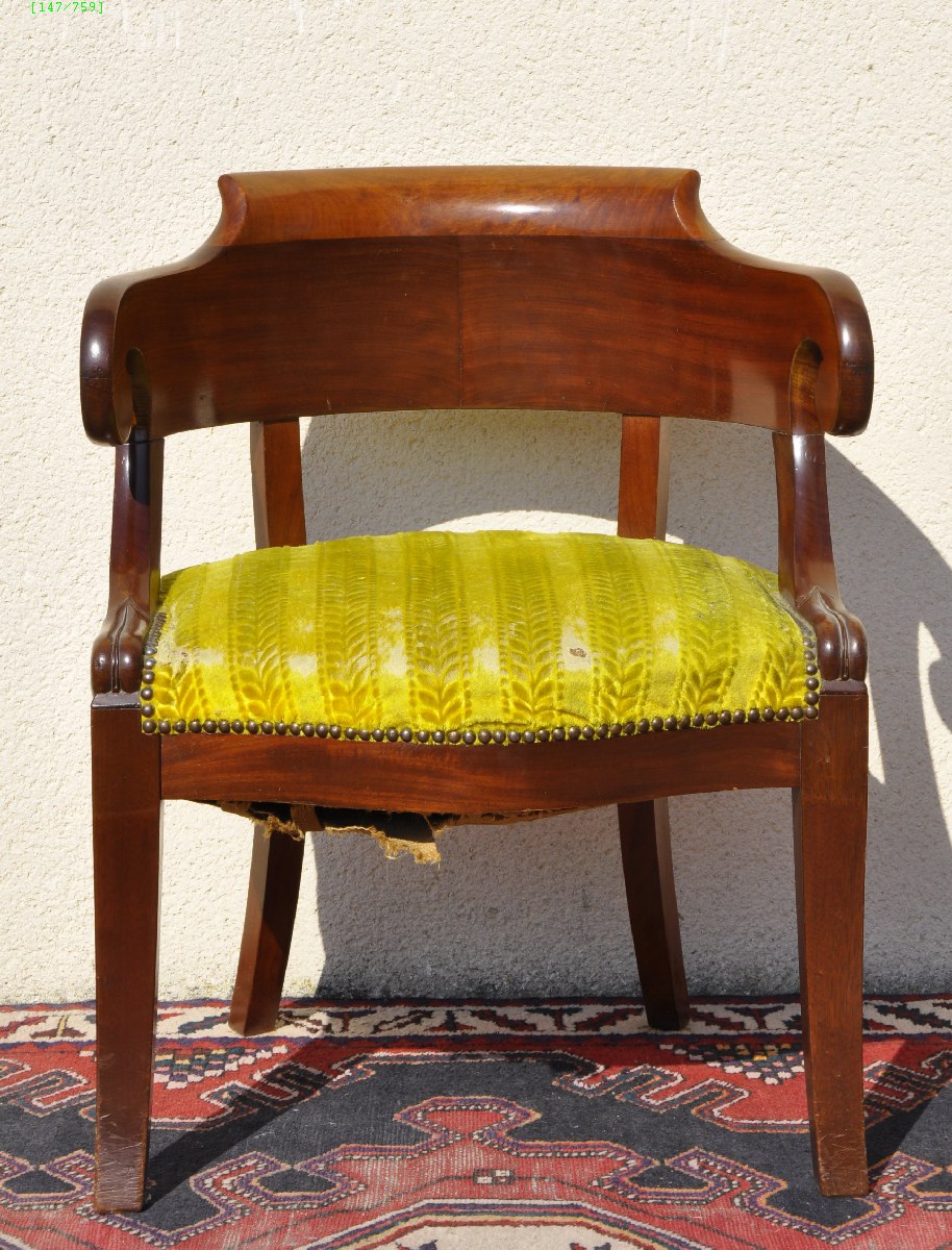 FAUTEUIL de bureau en acajou. Pieds antérieurs légèrement cambrés, pieds postérieurs en sabre. Dossier en bandeau renversé et accotoirs à volutes.