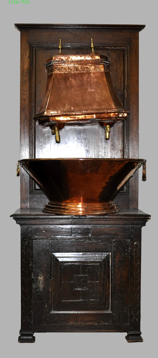 Réserve d'eau: Haut. 53, Larg. 48, Prof. 23 cm. (l'un des robinets ressoudé et légèrement différent)