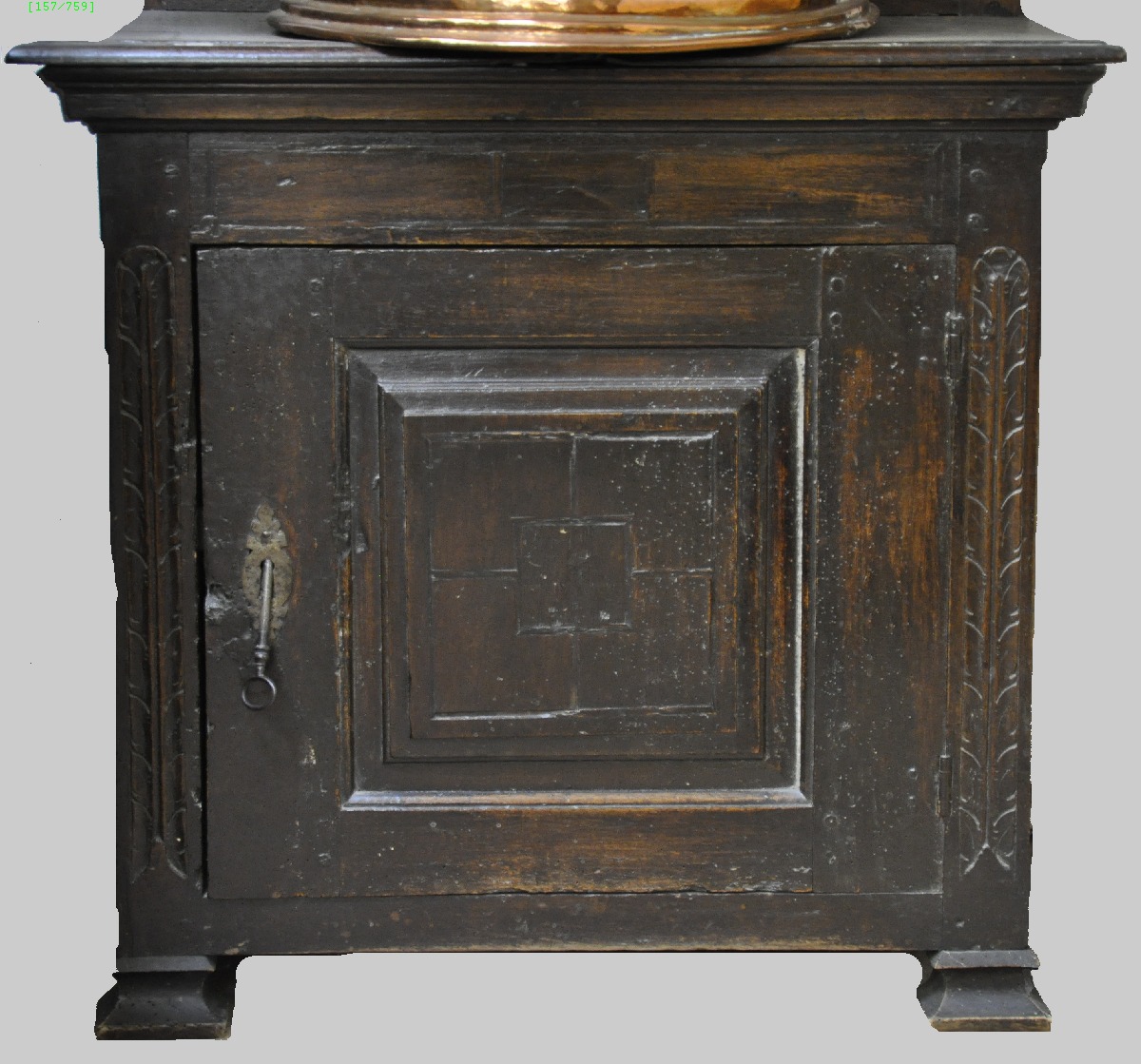 Meuble support en noyer, ouvrant par une porte en partie inférieure, avec montants sculptés de palmes stylisées. Partie supérieure en chêne, moderne.