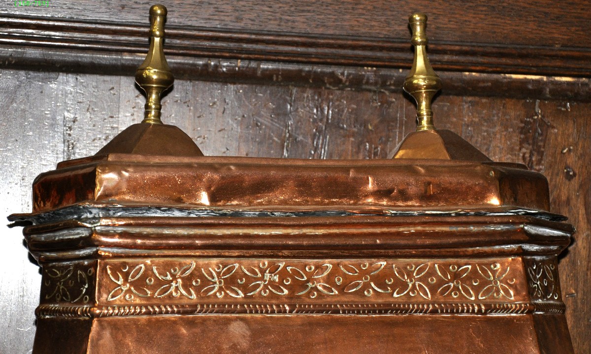 FONTAINE en cuivre. Réserve d'eau de forme évasée, ornée sous le couvercle d'une frise de motifs géométriques. Robinets et prises du couvercle en laiton ouvragé. Bassin évasé, reposant sur un piédouche en escalier, avec deux anses mobiles de part et d'autre.