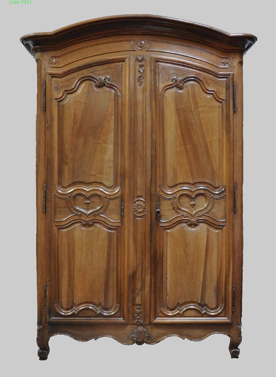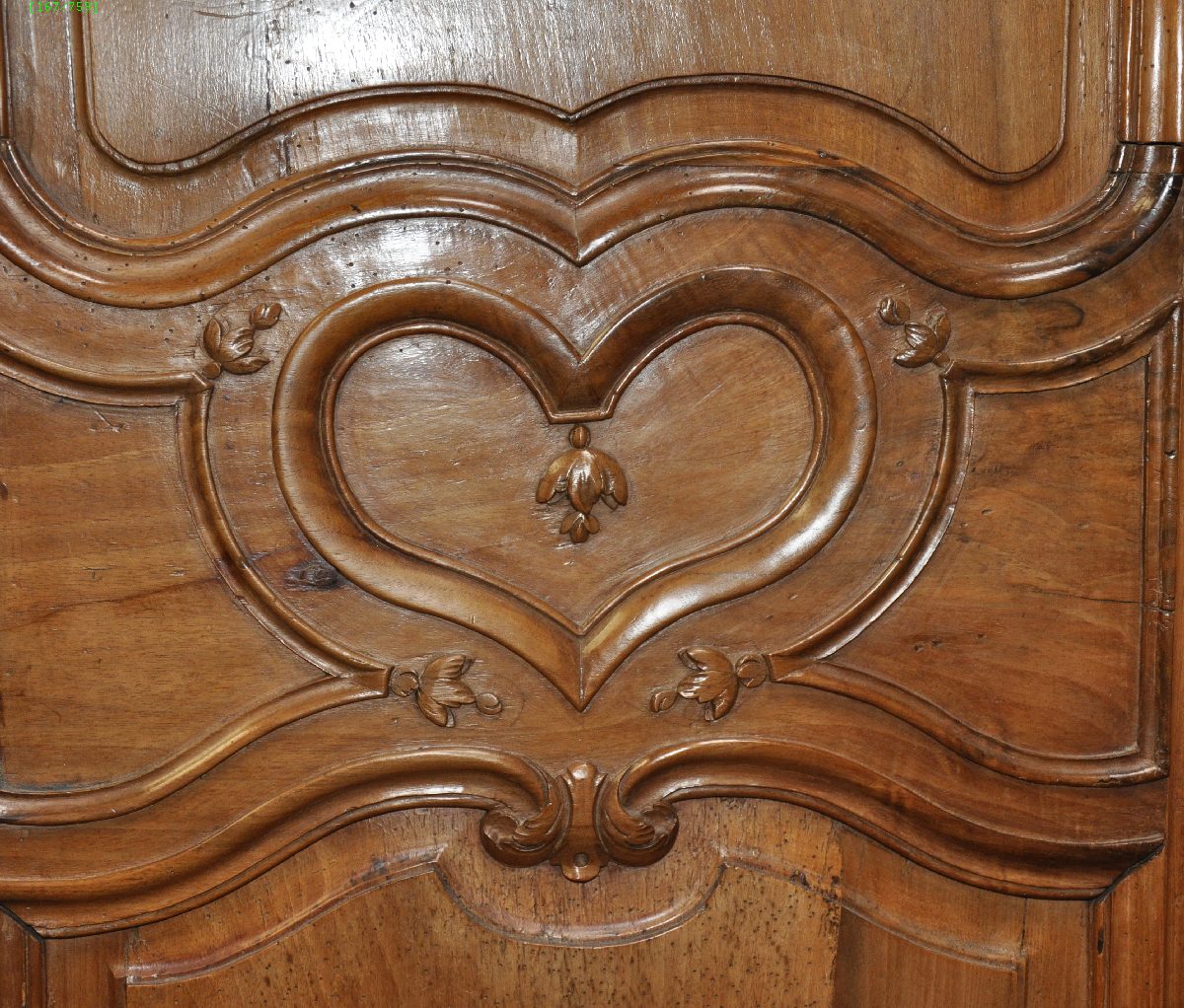 Grande ARMOIRE en noyer mouluré et sculpté. Partie supérieure à chapeau de gendarme. Elle ouvre par deux vantaux à trois panneaux moulurés, celui du centre en forme de cur et orné de fleurettes. Traverse supérieure et faux-dormant à décor de fleurs. Traverse inférieure chantournée et sculptée d'une coquille. Repose sur de petits pieds cambrés en escargot. Côtés panneautés. Garnitures de fer forgé ; belle serrure ouvragée à longs pennes.