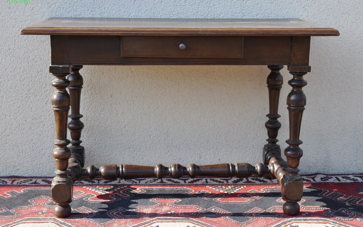 TABLE en noyer reposant sur quatre pieds tournés, réunis par une entretoise. Plateau à bordure moulurée. Un tiroir en ceinture.