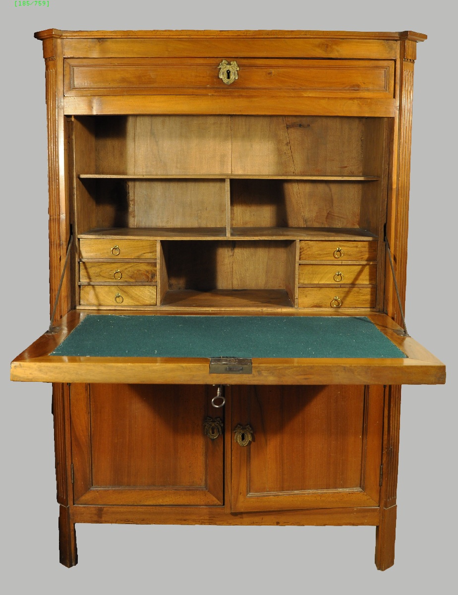 SECRÉTAIRE à abattant en noyer mouluré. Il ouvre par un grand tiroir en partie supérieure. L'abattant découvre un intérieur garni de casiers et de six tiroirs. Deux portes en partie inférieure. Montants à pans coupés et cannelés. Entrées de serrures en bronze doré, à motifs de guirlandes de feuillages et rubans.