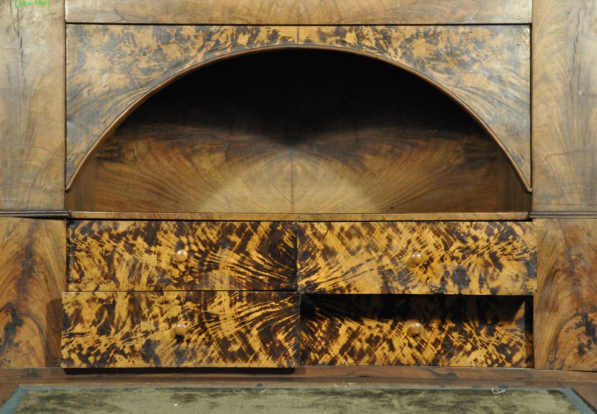 SECRÉTAIRE à abattant en placage d'acajou rayonné. Il ouvre par un grand tiroir en partie supérieure. L'abattant, foncé d'un velours vert, découvre un intérieur en placage de bois clair, garni de quatre tiroirs, surmontés d'un casier en demi-lune, et de deux tiroirs dissimulés, ouvrant par un mécanisme à ressort. Deux portes en partie inférieure. Entrées de serrure en bronze, à décor de guirlandes de feuilles et de fleurs.