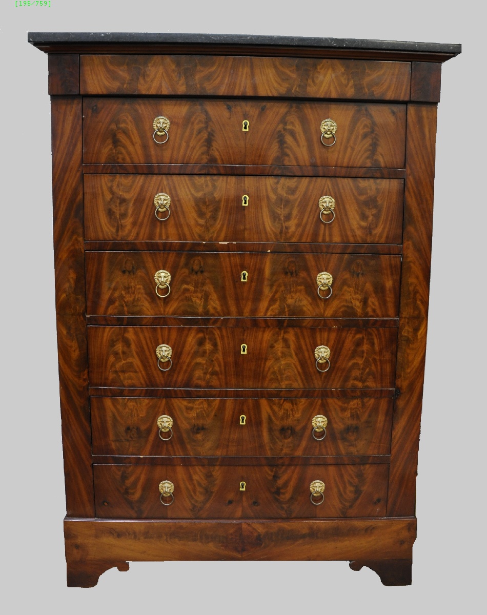 CHIFFONNIER en placage d'acajou flammé, ouvrant par six tiroirs, et par un septième en corniche. Pieds à volutes. Dessus de marbre gris.