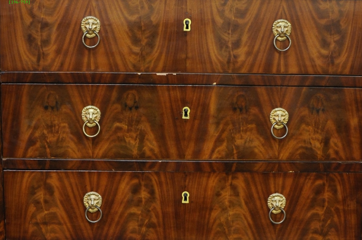 Garnitures de bronze doré, telles qu'entrées de serrures et poignées mobiles à têtes de lions.