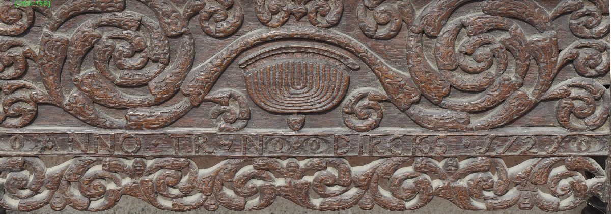 BANC-COFFRE en chêne sculpté de volutes et de feuillages stylisés, avec une inscription gravée en partie inférieure: "Anno Trin Dircks 1721". Pieds tournés.