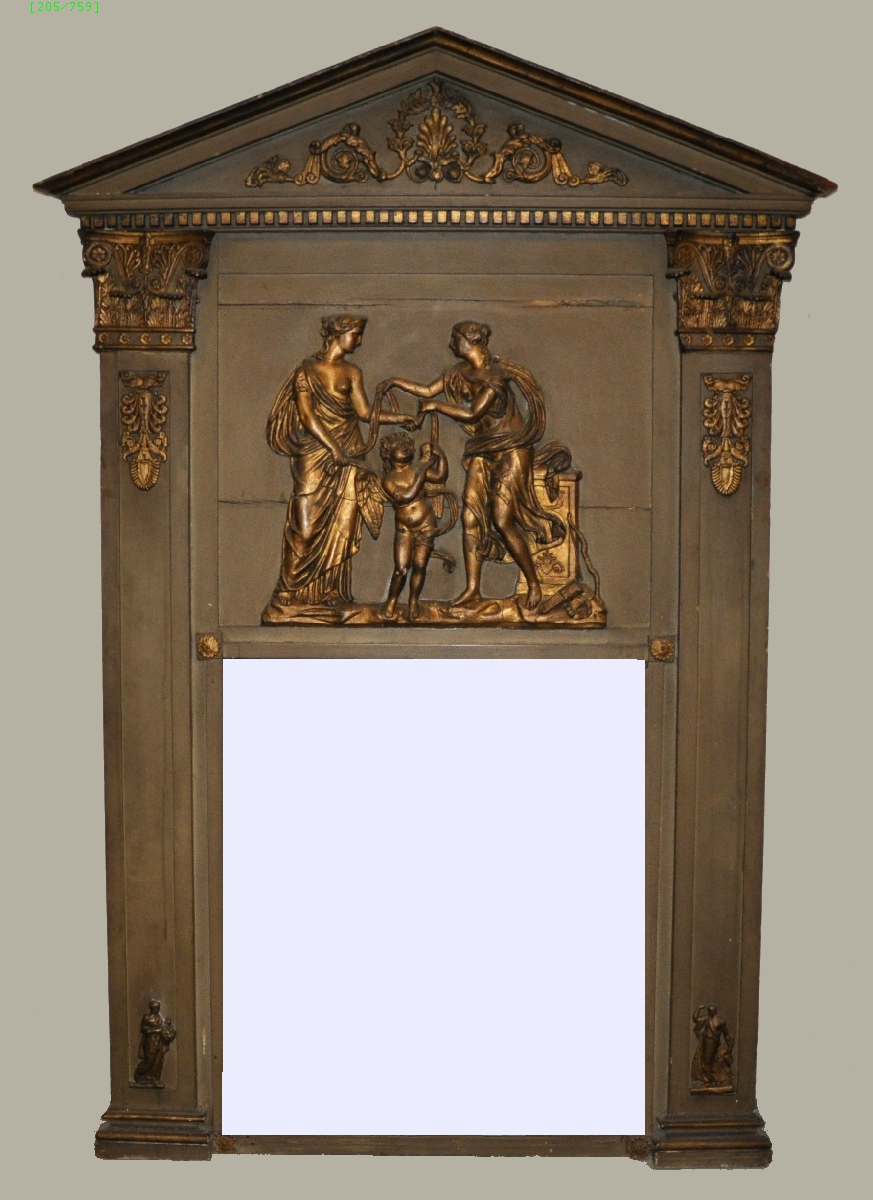 TRUMEAU en bois stuqué et laqué crème. Le miroir est surmonté d'une scène à l'antique en bas-relief. Traverse supérieure en forme de fronton, décorée de palmettes et d'entrelacs. Montants à pilastres à chapiteaux ioniques.