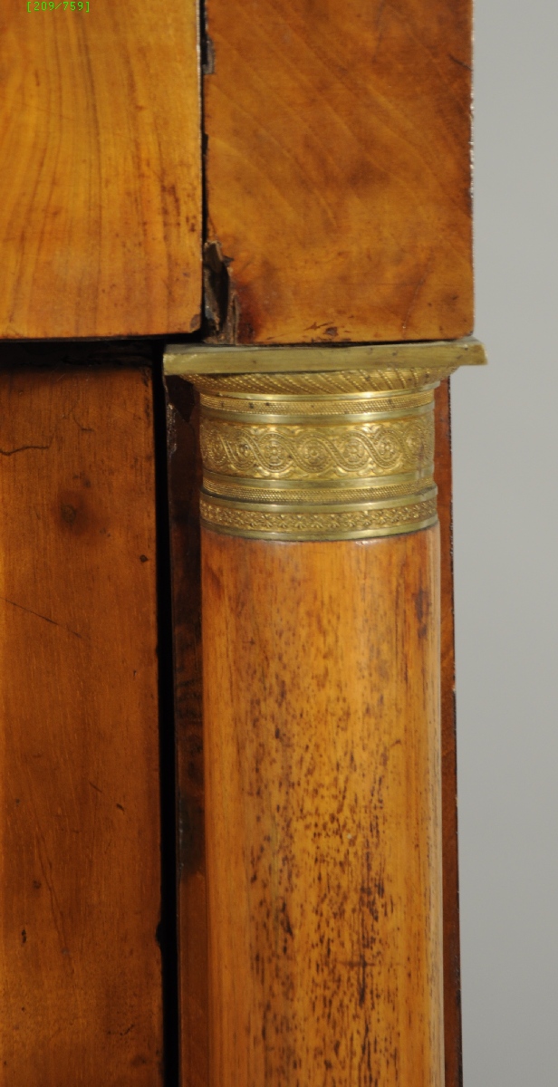 SECRÉTAIRE à abattant en noyer et placage de noyer. Façade à colonnes détachées, reposant sur des pieds ronds. Il ouvre par quatre tiroirs, dont un dissimulé en partie supérieure. L'abattant, foncé de cuir rouge à bordure dorée, découvre un intérieur garni d'un large casier à colonnettes de part et d'autre, et surmontant huit tiroirs, dont deux dissimulés. Garnitures de bronze ciselé et doré, telles que poignées de tirage mobiles, entrées de serrures et chapiteaux de colonnes. Dessus de marbre gris veiné blanc.