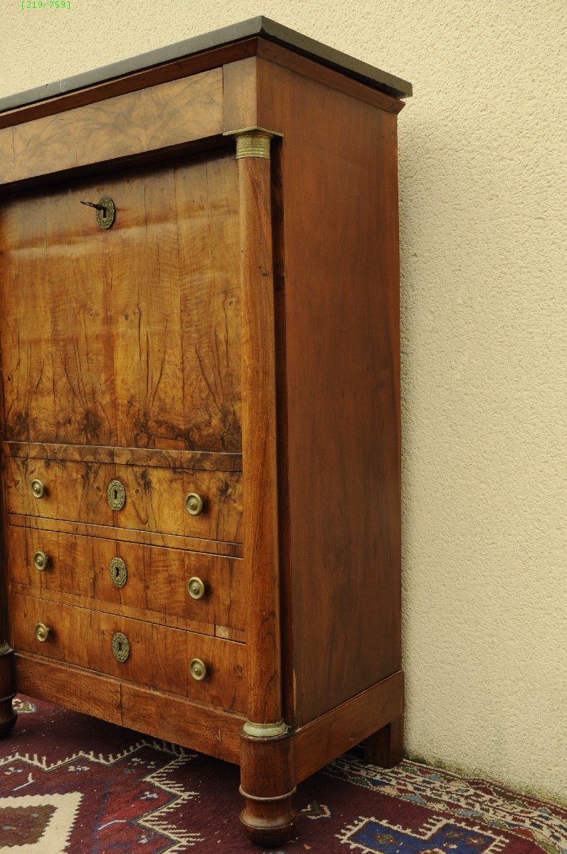 Garnitures de bronze doré telles que chapiteaux de colonnes, poignées de tirage et entrées de serrure. Dessus de marbre noir.