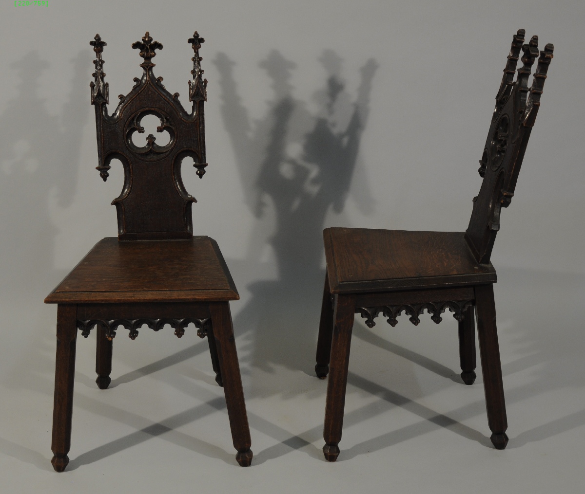 Paire de CHAISES en chêne. Dossiers à pinacles et fenestrages. Assises trapézoïdales.