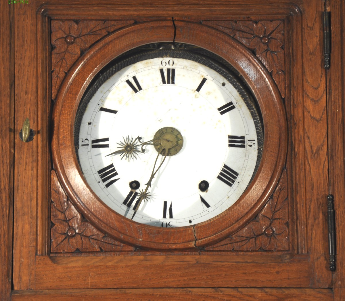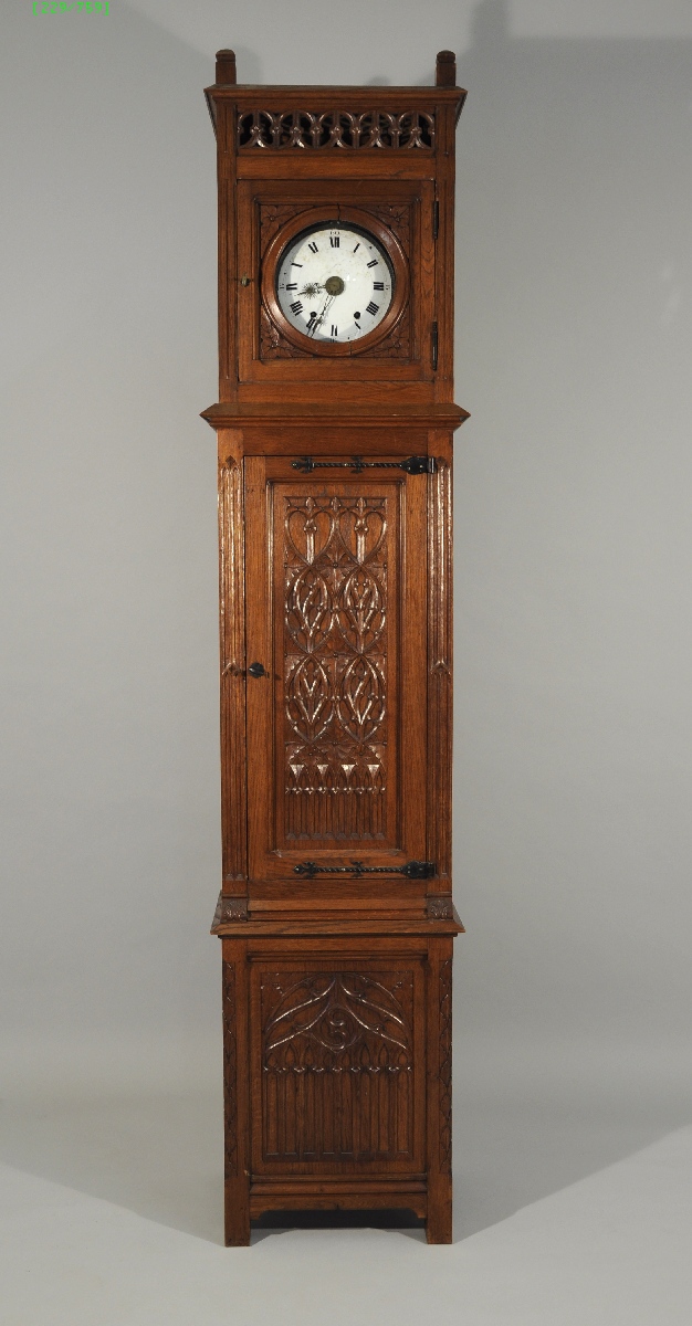 HORLOGE en chêne sculpté. Décor à fenestrages en façade, et à plis de serviettes sur les côtés.