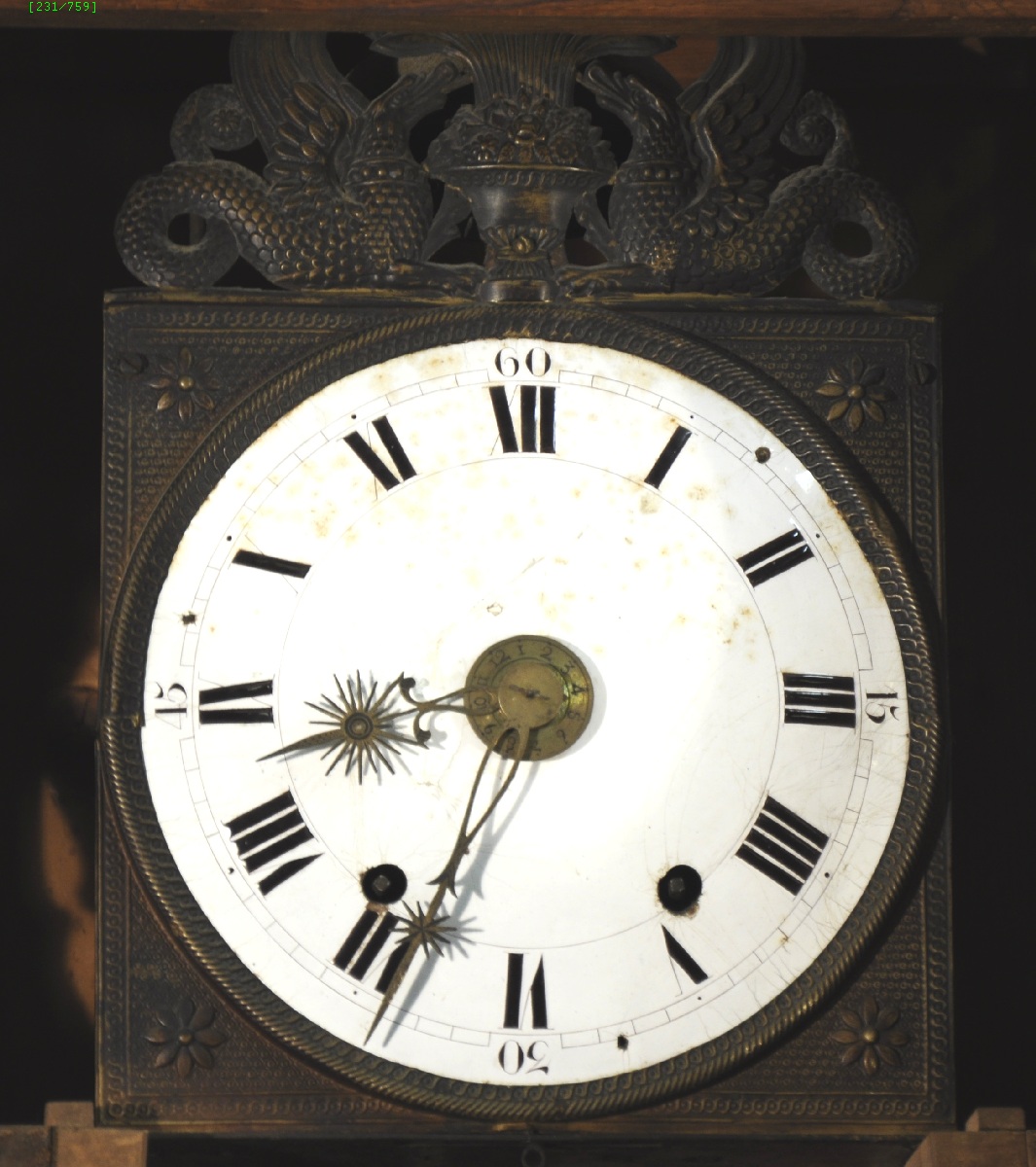 Mouvement XIXe. Cadran émaillé blanc, indiquant les heures en chiffres romains et les minutes en chiffres arabes, surmonté d'un fronton en laiton repoussé, à décor de chimères de part et d'autre d'un vase fleuri surmonté d'une palmette.