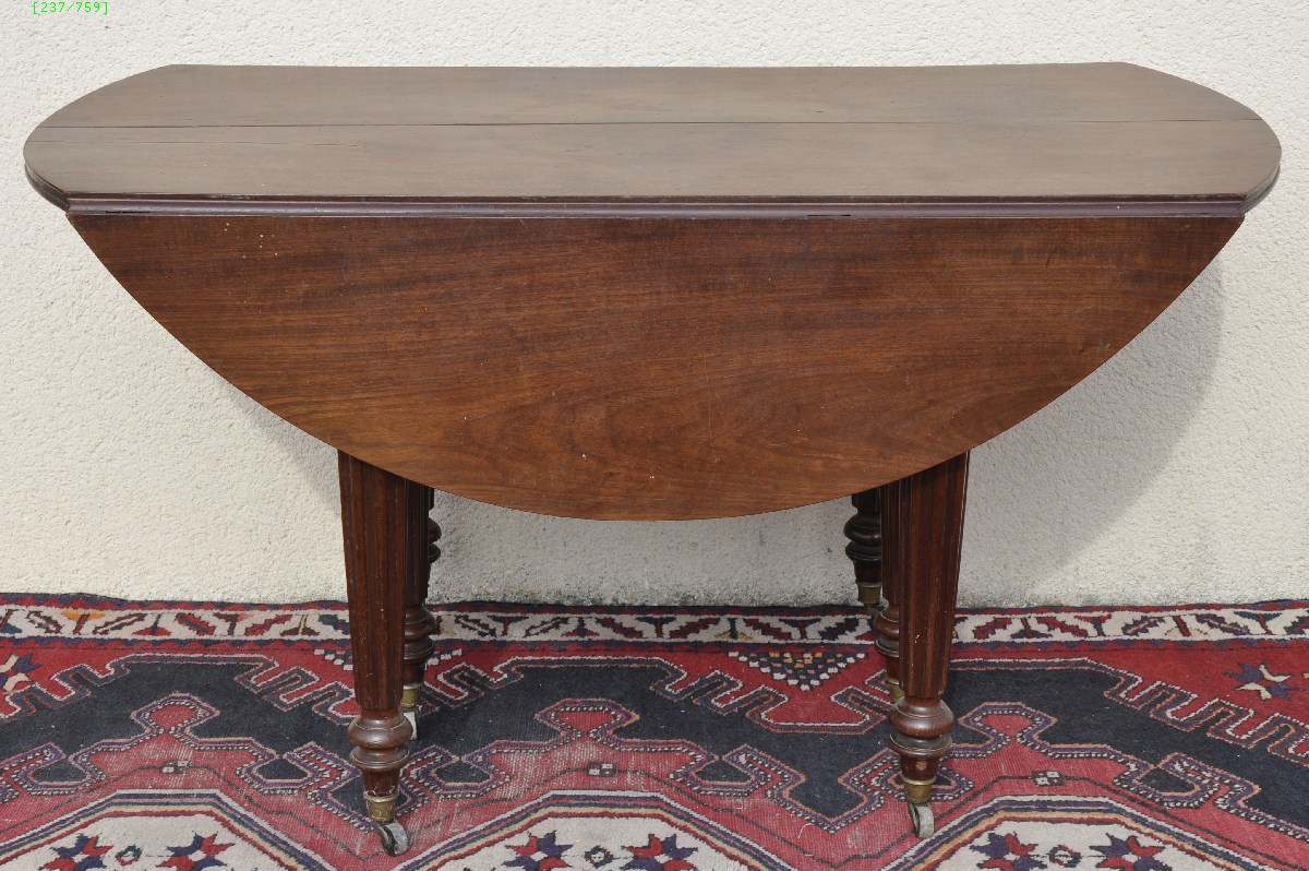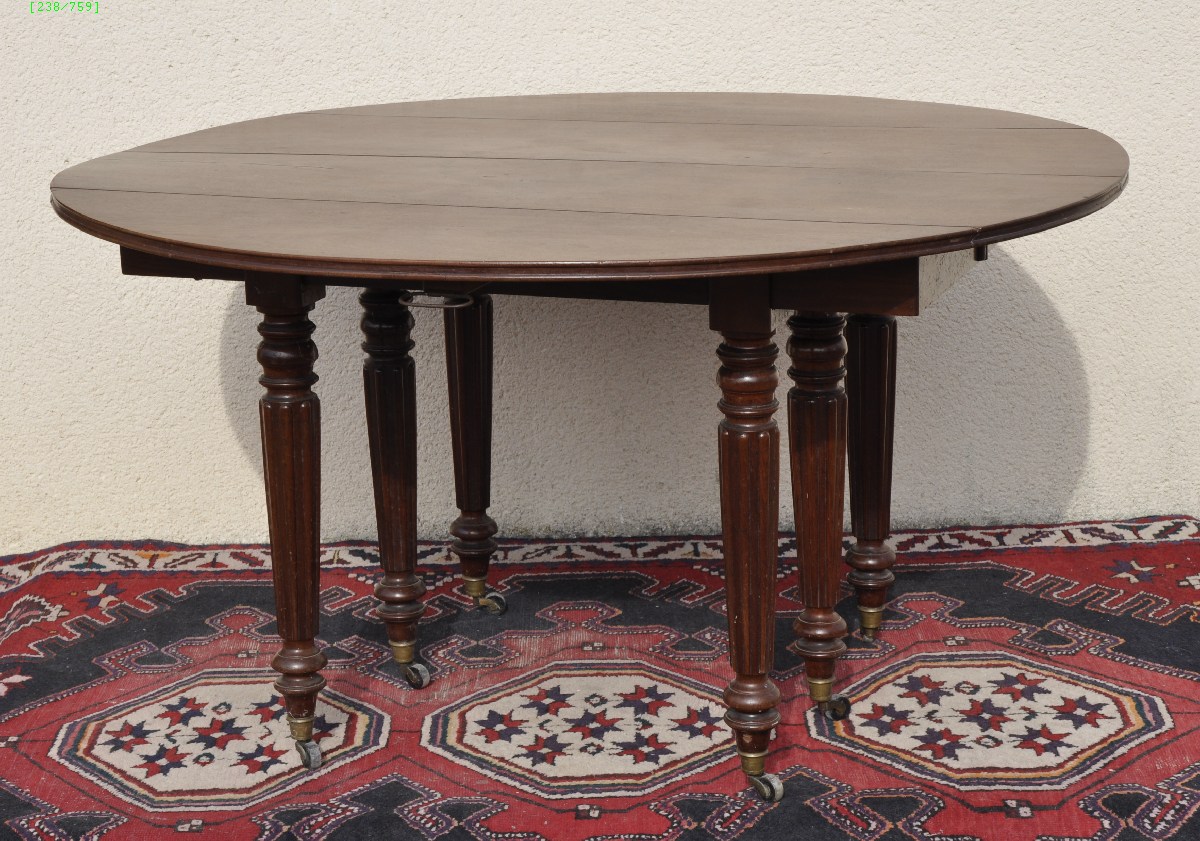 TABLE à abattants en acajou et placage d'acajou. Elle repose sur six pieds tournés, montés sur roulettes.