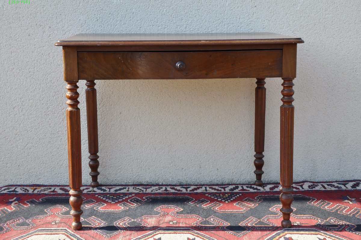 TABLE-BUREAU en acajou et placage d'acajou. Elle ouvre par un large tiroir en ceinture et repose sur quatre pieds tournés.