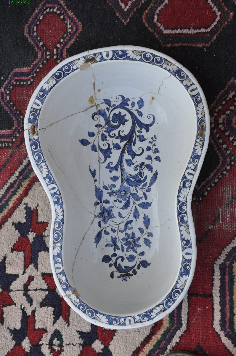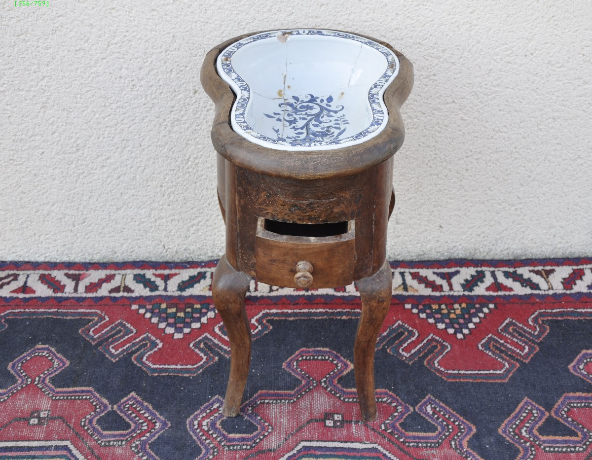 BIDET en bois naturel, à piétement cambré, ceinture chantournée, et ouvrant par un tiroir. Cuvette en faïence à décor d'une corne fleurie en bleu et manganèse de grand feu.