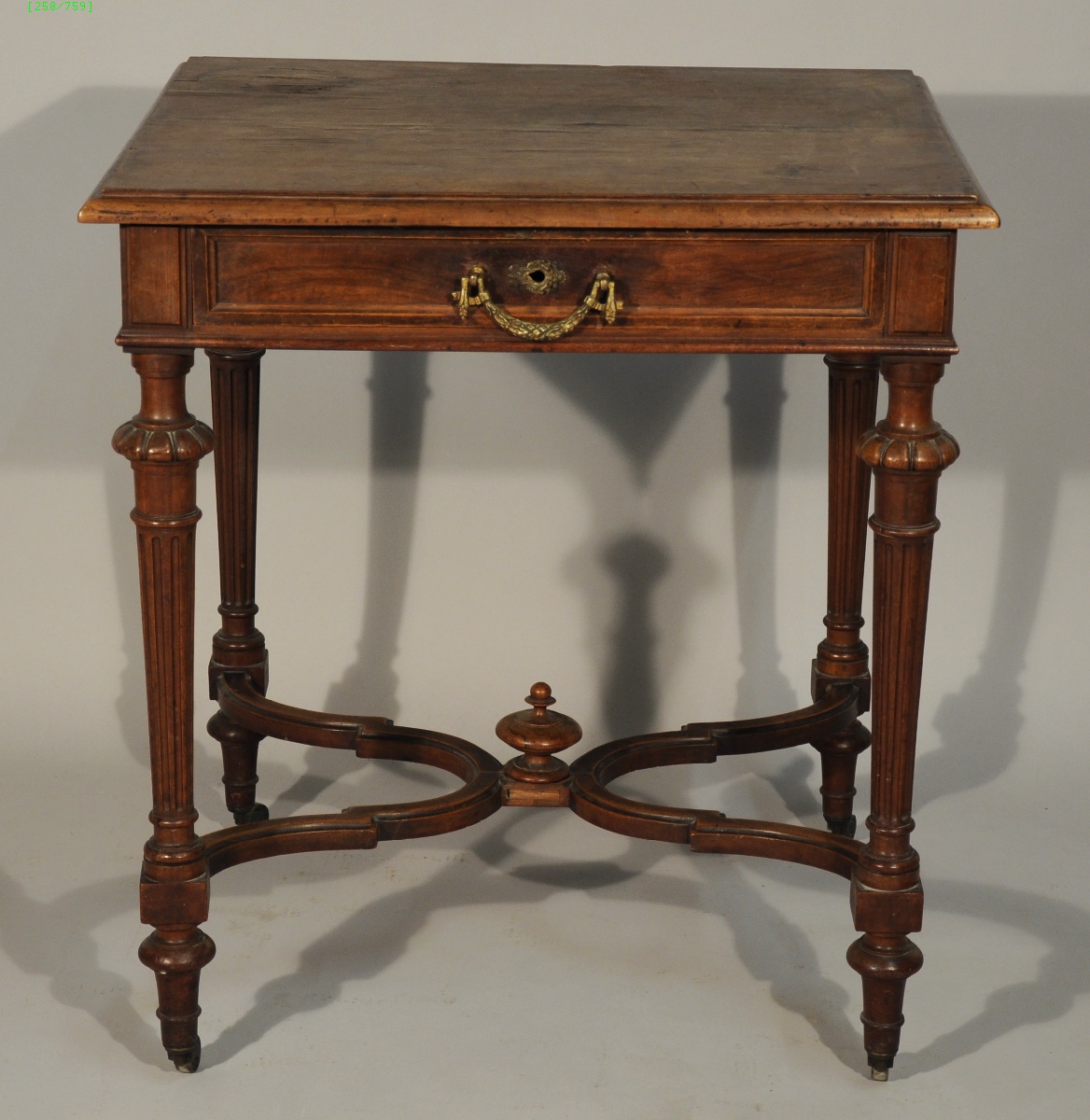 TABLE en noyer mouluré et placage de noyer. Elle ouvre par un tiroir en ceinture. Pieds fuselés et cannelés, sur roulettes, réunis par une entretoise chantournée.