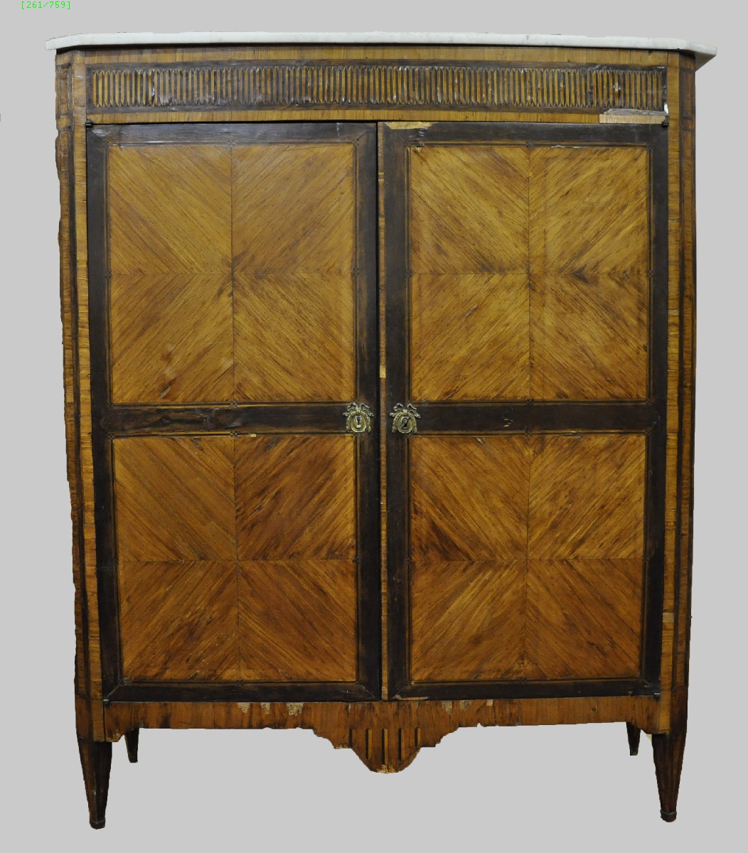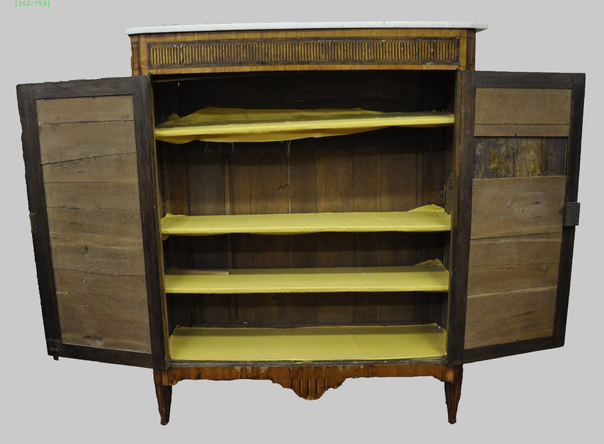 MEUBLE à HAUTEUR d'APPUI en bois de rose plaqué en frise et marqueterie, dans des encadrements de palissandre. En partie supérieure et au cul-de-lampe, frise géométrique. Pieds carrés fuselés. Garnitures de bronze, telles qu'entrées de serrures à guirlandes de feuilles et rubans, et sabots de pieds.
