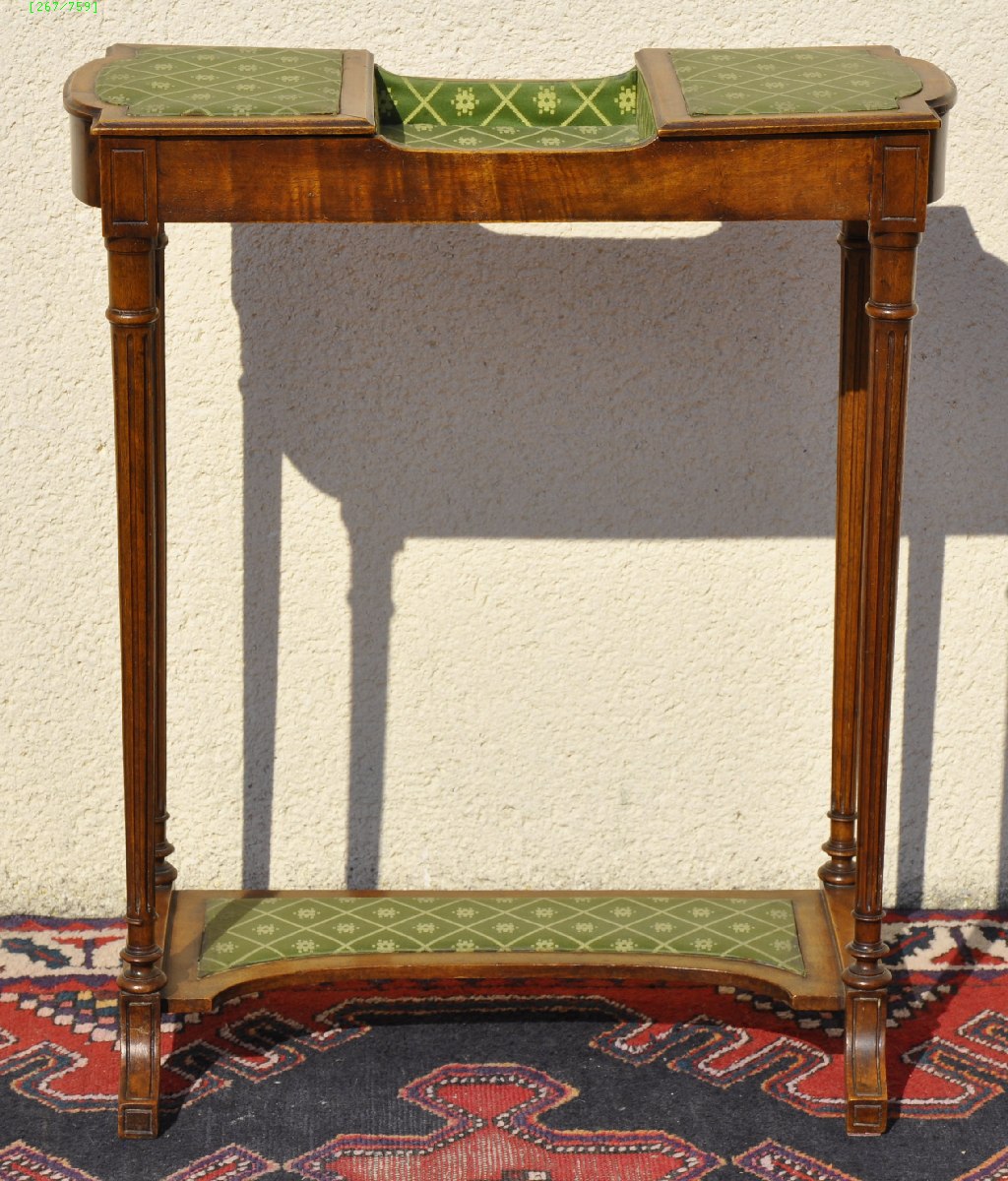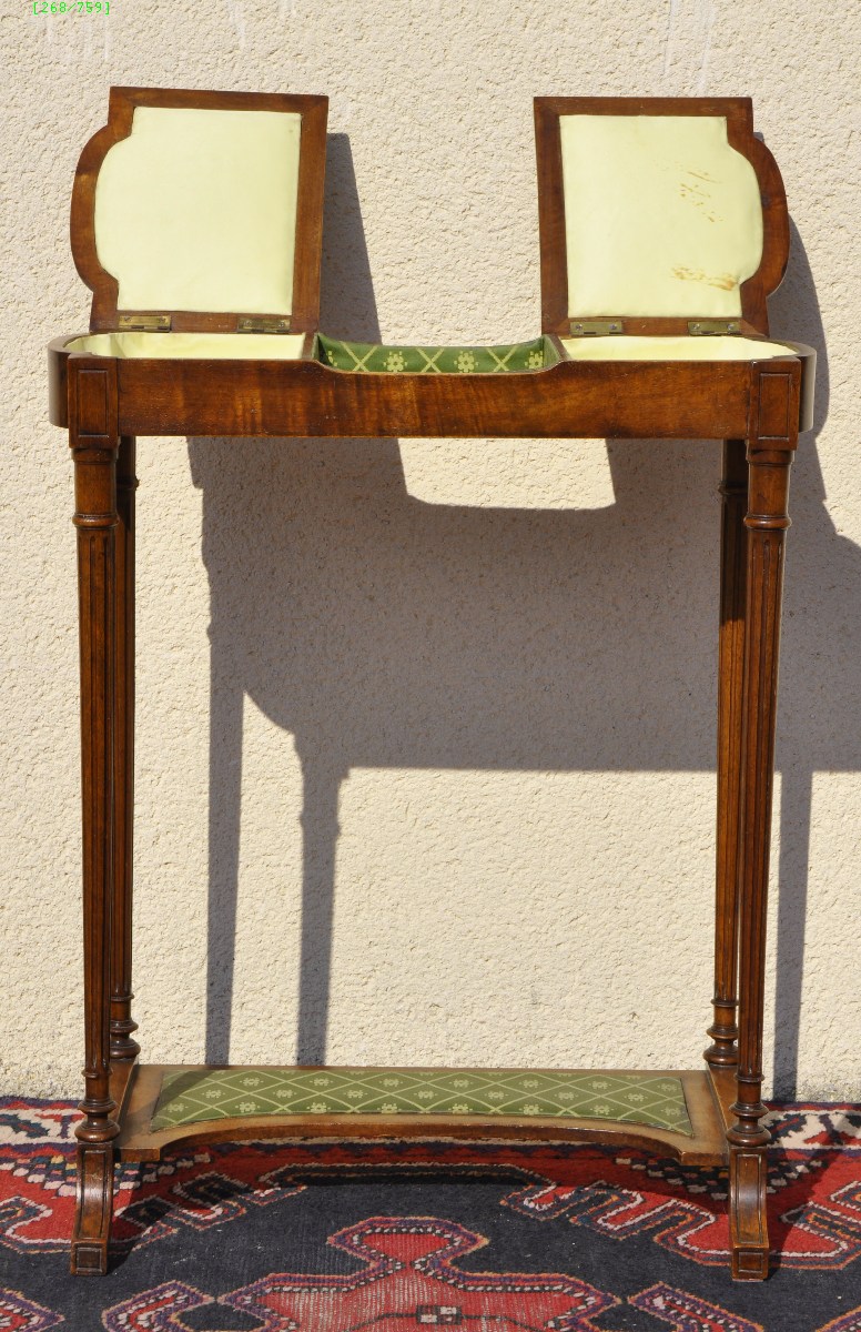 TRAVAILLEUSE en noyer. La partie supérieure comporte trois casiers, ceux des extrémités munis d'abattants. Pieds cannelés et fuselés. Tablette d'entrejambe. Garniture de tissu vert à motifs géométriques et croisillons.