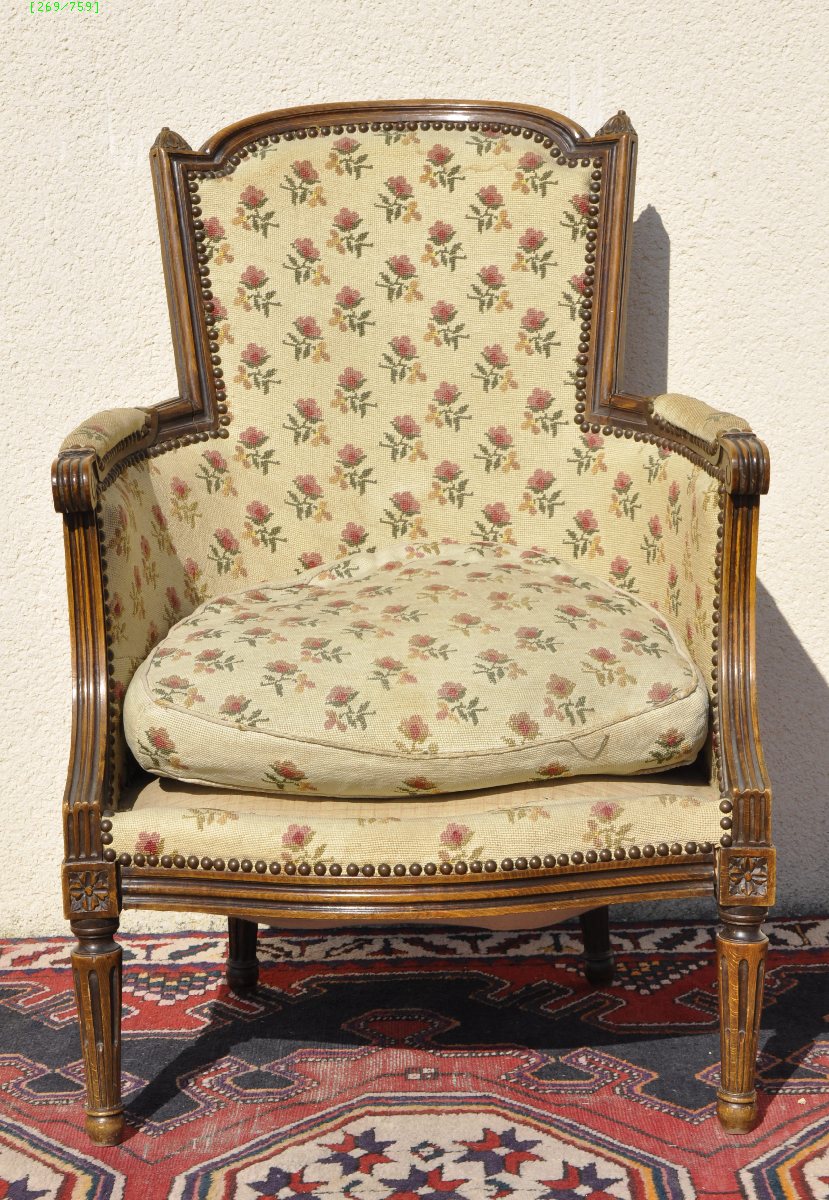 BERGÈRE en hêtre mouluré et sculpté. Dossier cabriolet à traverse supérieure en chapeau de gendarme. Pieds cannelés et rudentés. Dés de raccordement sculpés de fleurettes.