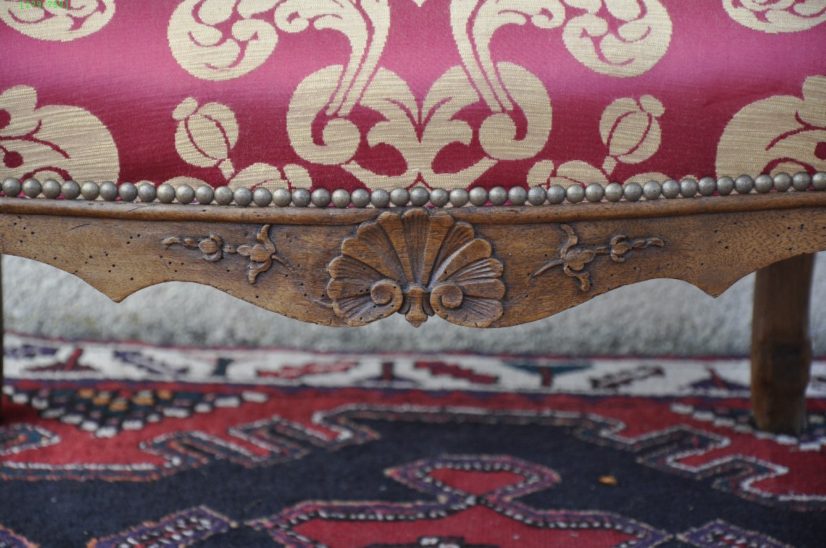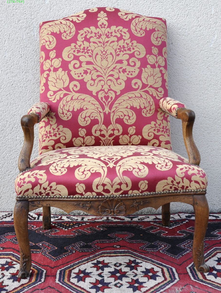 FAUTEUIL à haut dossier plat, en bois naturel dit à la capucine, mouluré et sculpté de coquille et panaches sur la ceinture. Pieds galbés, antés et antérieurs feuillagés.