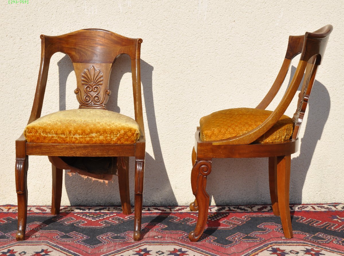 PAIRE DE CHAISES GONDOLES, en acajou et placage d'acajou. Le dossier enveloppant ajouré est sculpté d'une palmette. Pieds postérieurs sabres, pieds antérieurs en "cuisse de grenouille".
