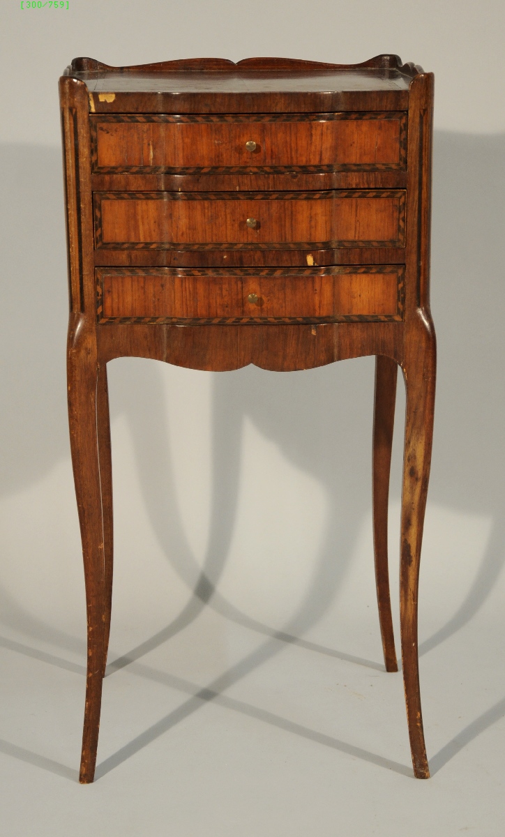TABLE CHIFFONNIÈRE en placage de bois de rose en frise. Elle ouvre par trois tiroirs à ressaut et repose sur des pieds cambrés. Ceinture et rebords du plateau chantourné. Décor de filets marquetés.