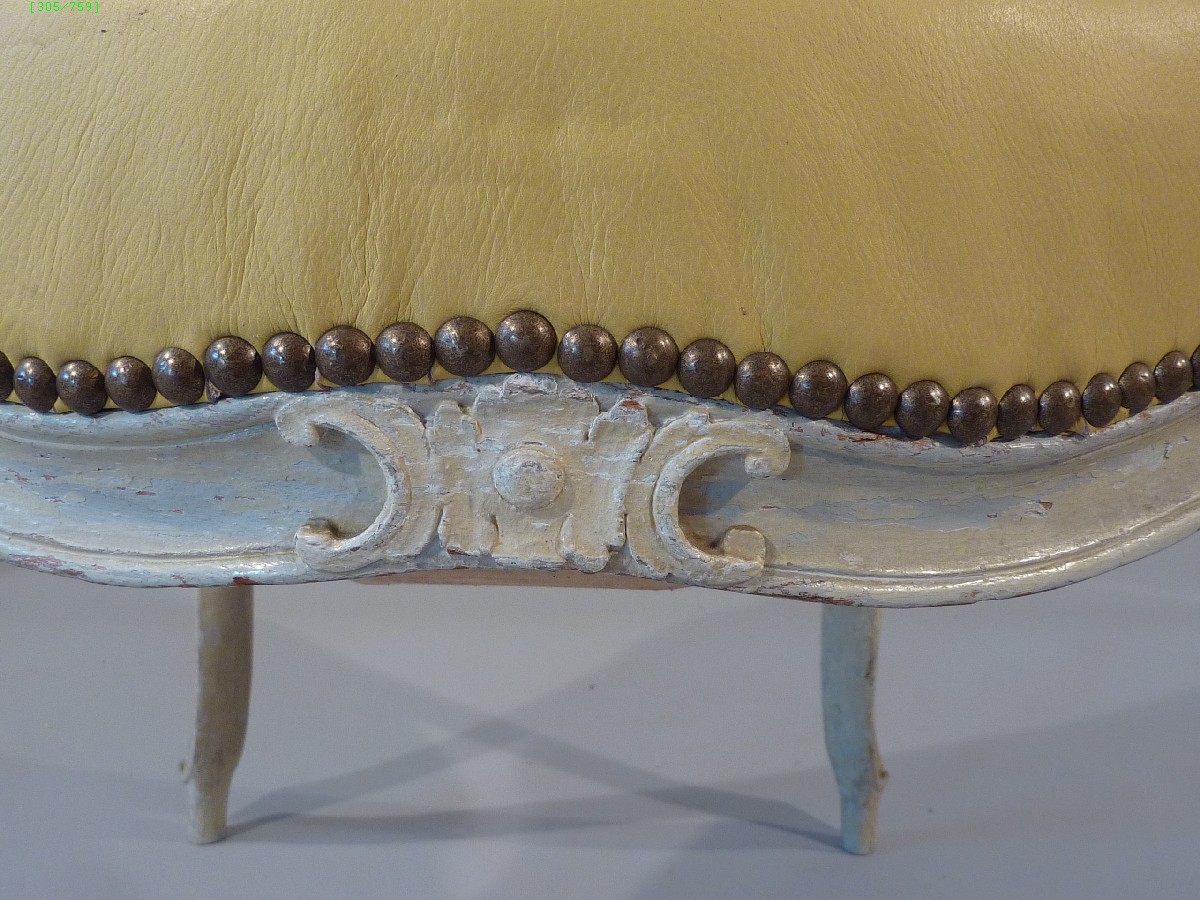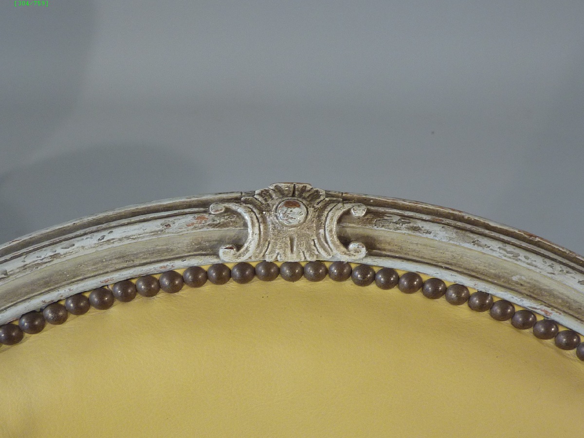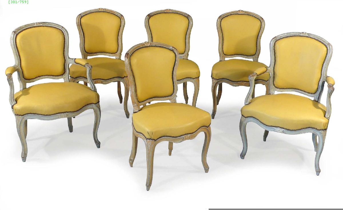 ENSEMBLE de SIX SIÈGES en hêtre mouluré, sculpté et relaqué comprenant: DEUX FAUTEUILS et une suite de QUATRE CHAISES. Dossier cabriolet. Les traverses à décor d'un cartouche centré d'un cabochon. Accotoirs en coup de fouet. Pieds cambrés.