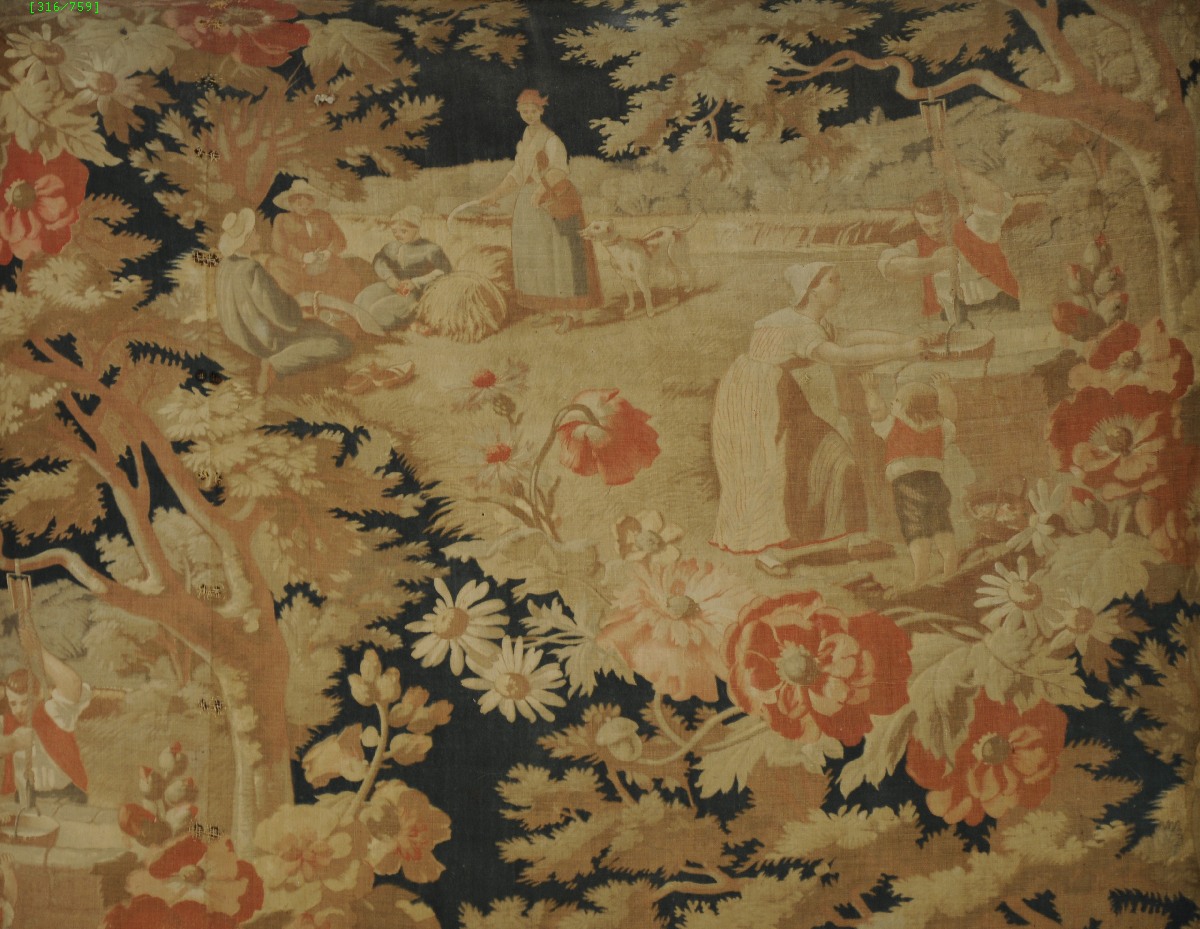 Garnitures de tissu à motif de scènes champêtres (déchirée).