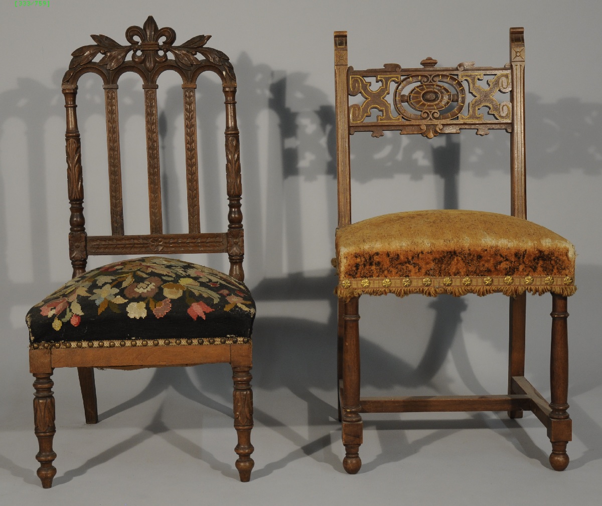 Joint: CHAISE en noyer à dossier sculpté de motifs de cuirs découpés. Style Henri II, fin XIXe. Haut. 88, Larg. 45, Prof. 44 cm.