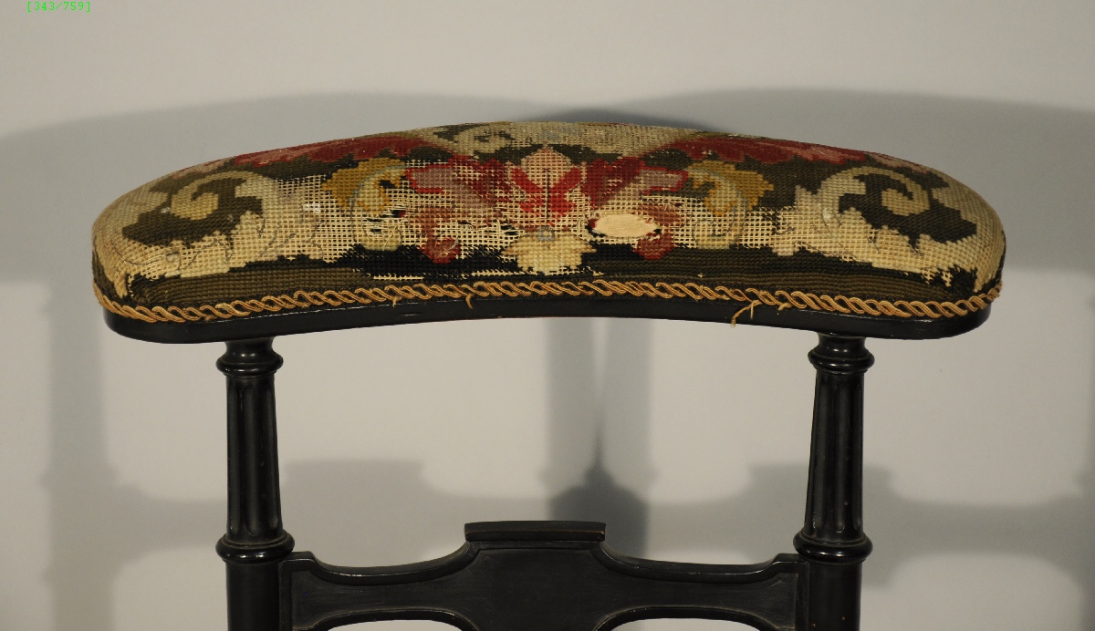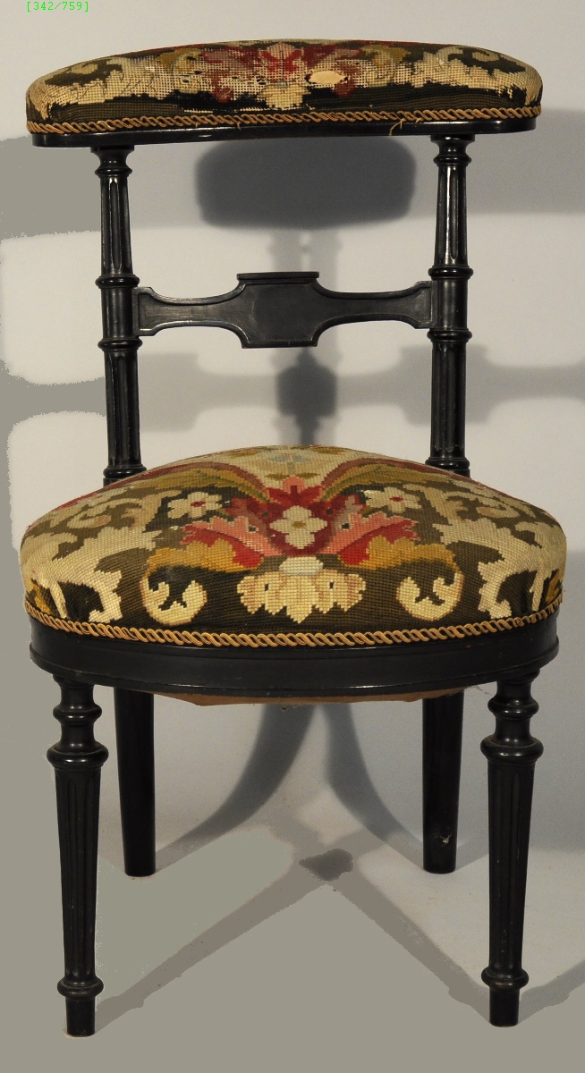 CHAISE en bois noirci. Pieds antérieurs et montants du dossier cannelés. Assise chantournée. Traverse supérieure du dossier garnie d'un accoudoir. Garniture de broderie au point à décor floral (usée).