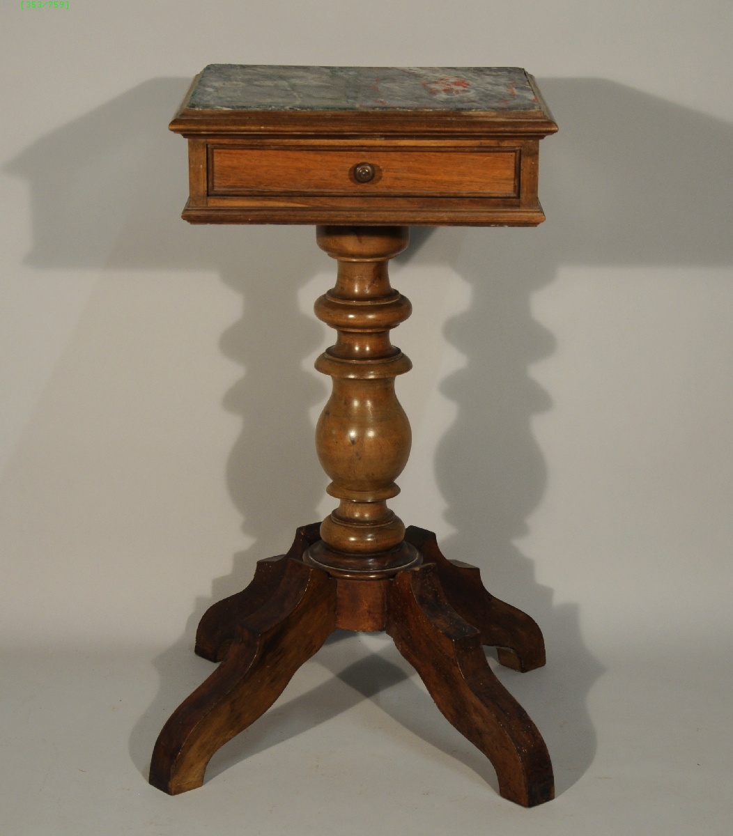 GUÉRIDON en noyer, ouvrant par un tiroir. Fût central tourné, reposant sur un piétement quadripode. Dessus de marbre gris veiné blanc accidenté.