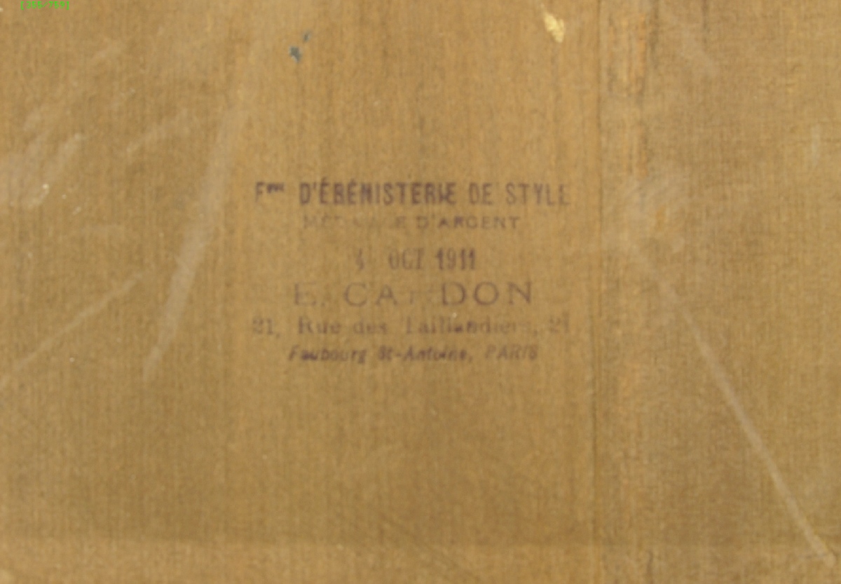 Porte une marque sur le plateau du corps inférieur: "Fque d'ébénisterie de style, Médaille d'argent, 4 octobre 1911, E.Cardon, 21 rue des Taillandiers, Faubourg Saint-Antoine, Paris"