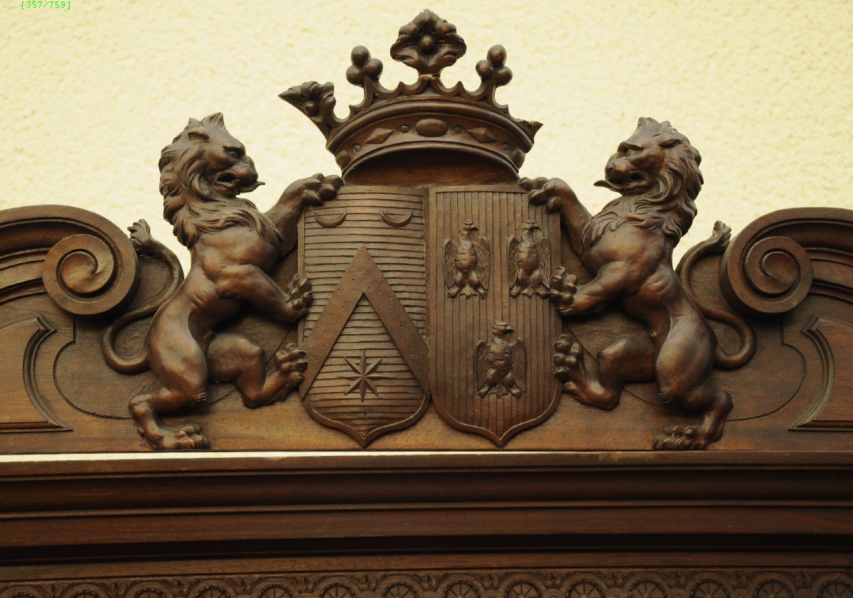 ENCOIGNURE en noyer formant vitrine en partie haute, ouvrant à un vantail à glace biseautée, flanqué de colonnes cannelées rudentées et l'intérieur foncé de glaces. La corniche sculptée d'une frise de roues dentelées et surmontée d'un fronton sculpté d'armoiries doubles, sommées d'une couronne tenues par des lions de chaque côté. La partie basse ouvrant à deux vantaux à motif de volutes feuillagées, nud de ruban et au centre un cartouche dans un médaillon. Plinthe moulurée à pans coupés reposant sur des boules aplaties.