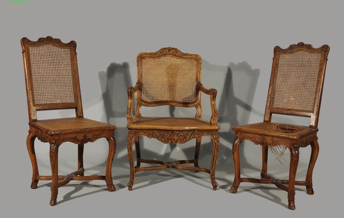 Joint: PAIRE DE CHAISES à la Reine en hêtre mouluré. Pieds cambrés réunis par une entretoise mouvementée. Décor sculpté de feuilles et coquilles. Pieds sabots. Canne.