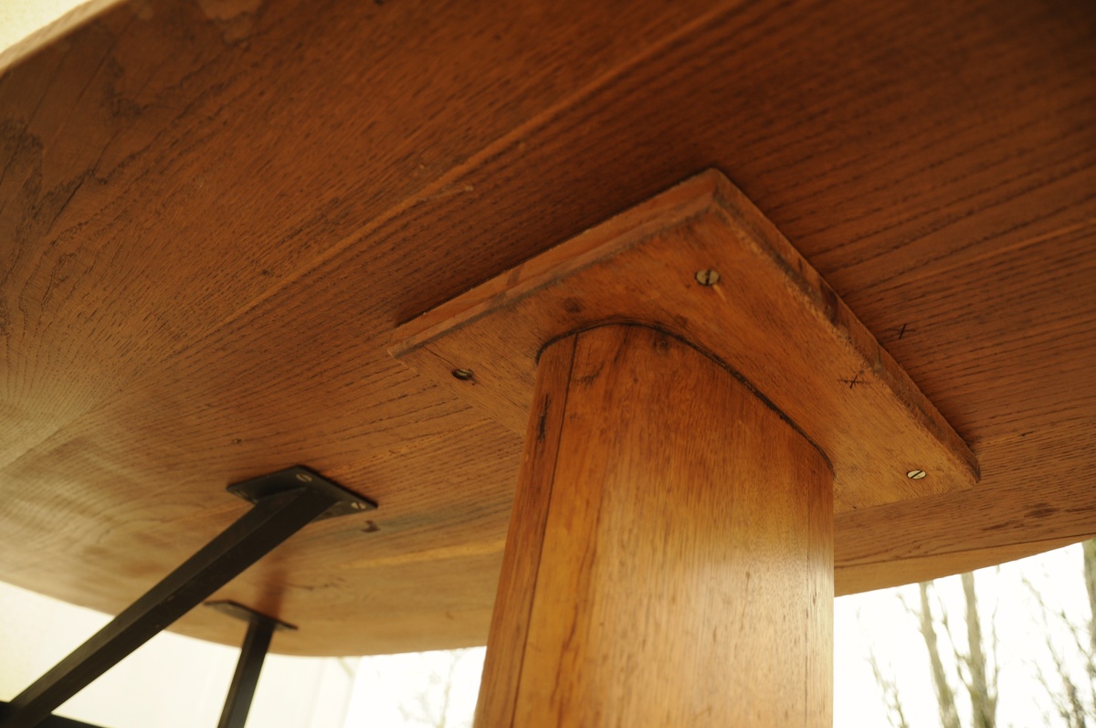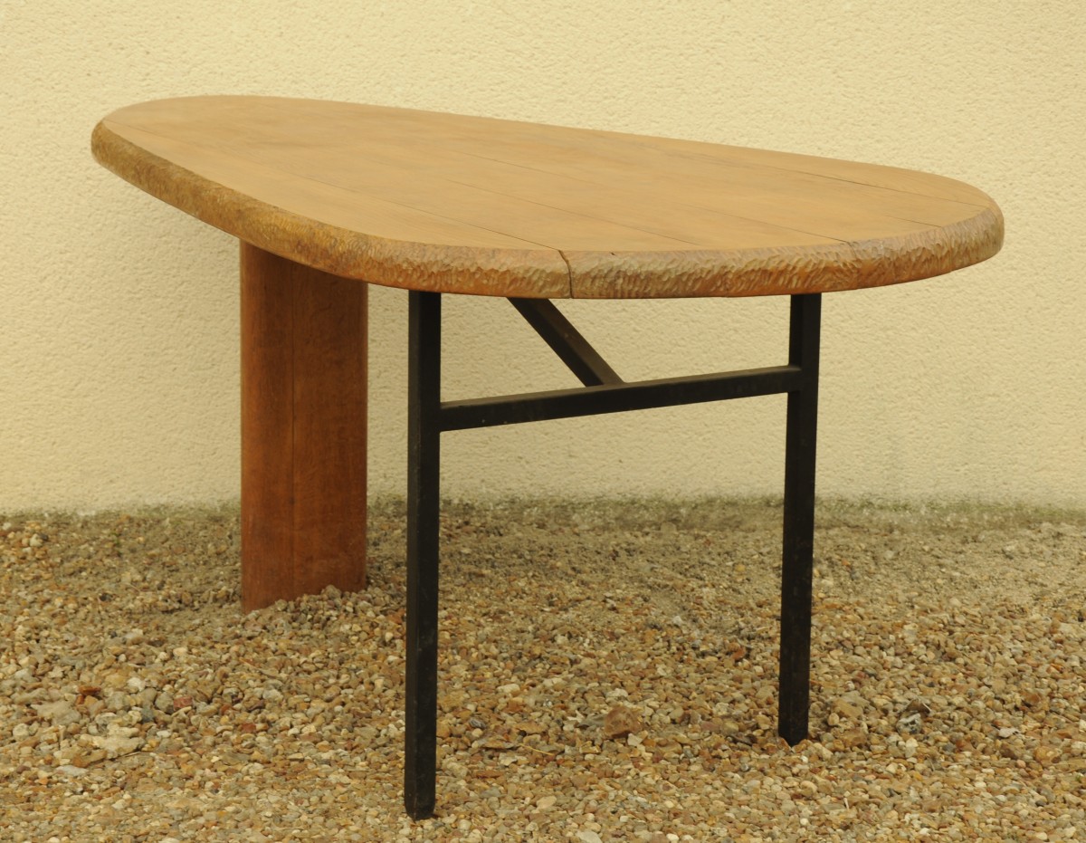 TABLE moderne en bois naturel clair. Plateau en forme d'amande, travaillé à la gouge sur la pourtour. Piètement métallique noir et montant en bois naturel. XXème siècle.