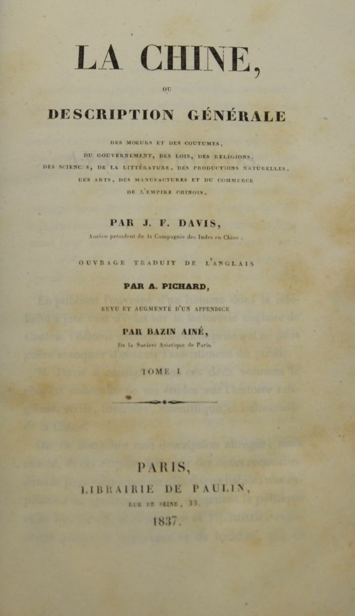 DAVIS. La Chine. Paulin, 1837.2 vol. in-8 1/2 rel. défr....