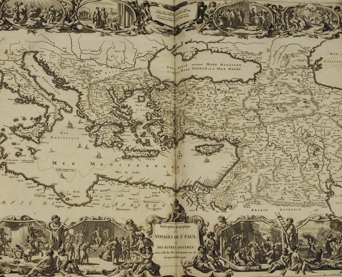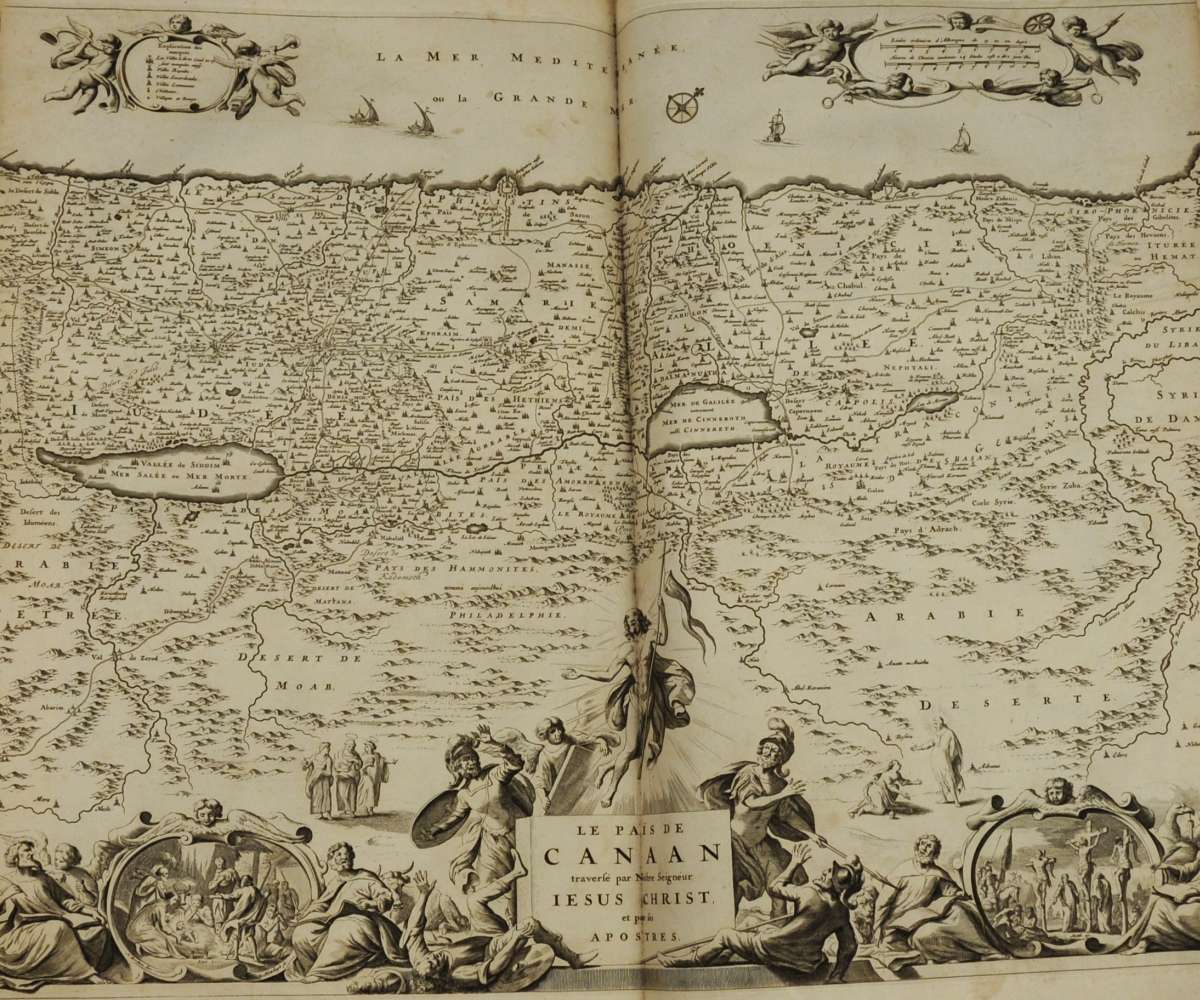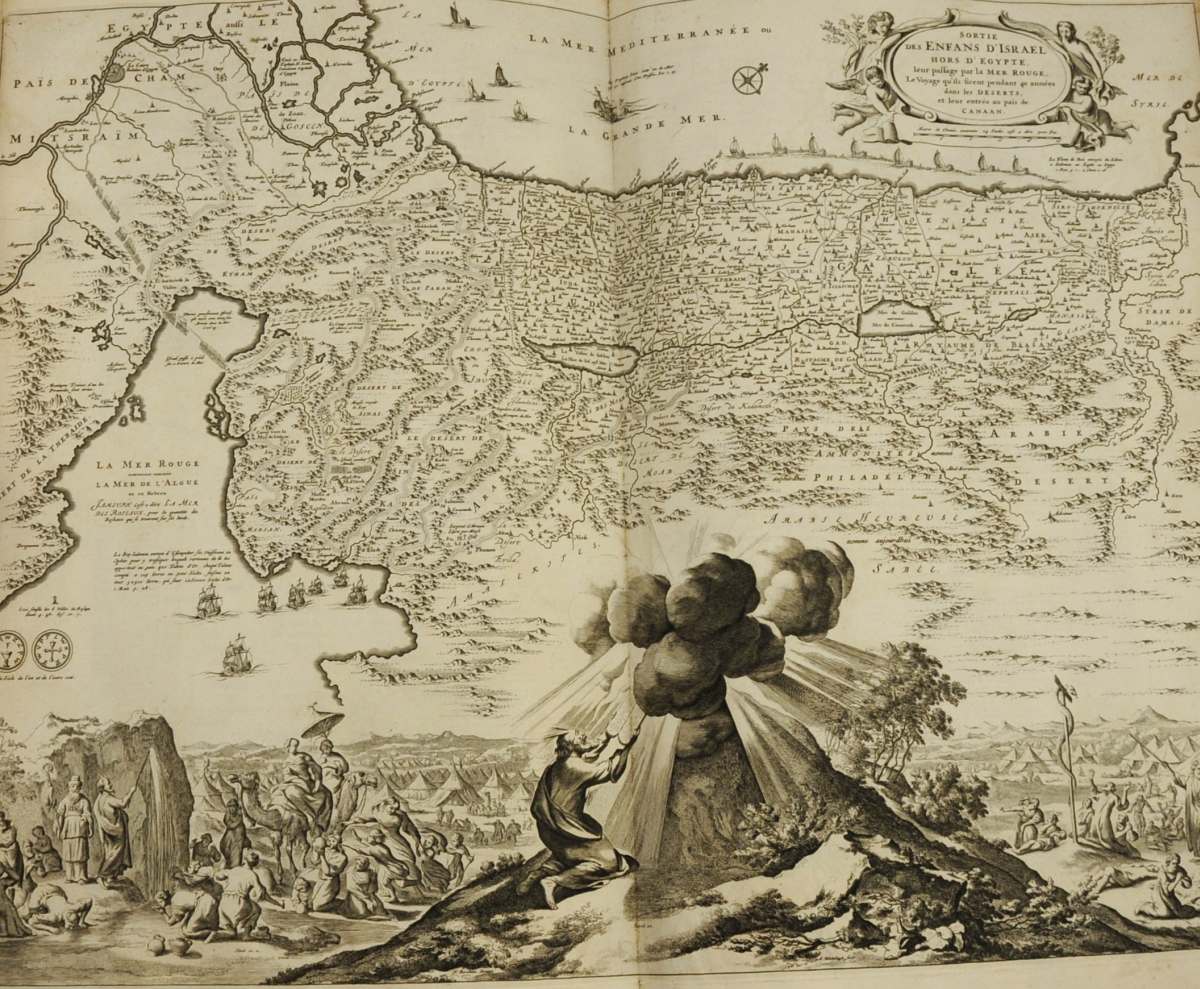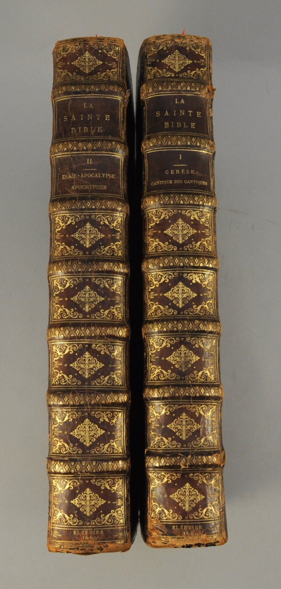 2 vol in-folio pl. rel. anc., qq déf. FT (restauré et contre-collé), P de T, 40 fll., 366 fll. num. au recto ; FT(Les prophéties), 1 fll., 162 fll., P de T (Le Nouveau Testament. 1669), 1 fll., 202 fll., 70 fll.