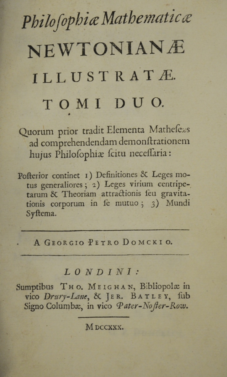 Philosophiae Mathematicae Newtonianae illustratae. Londini, Meighan, Matley, 1730.