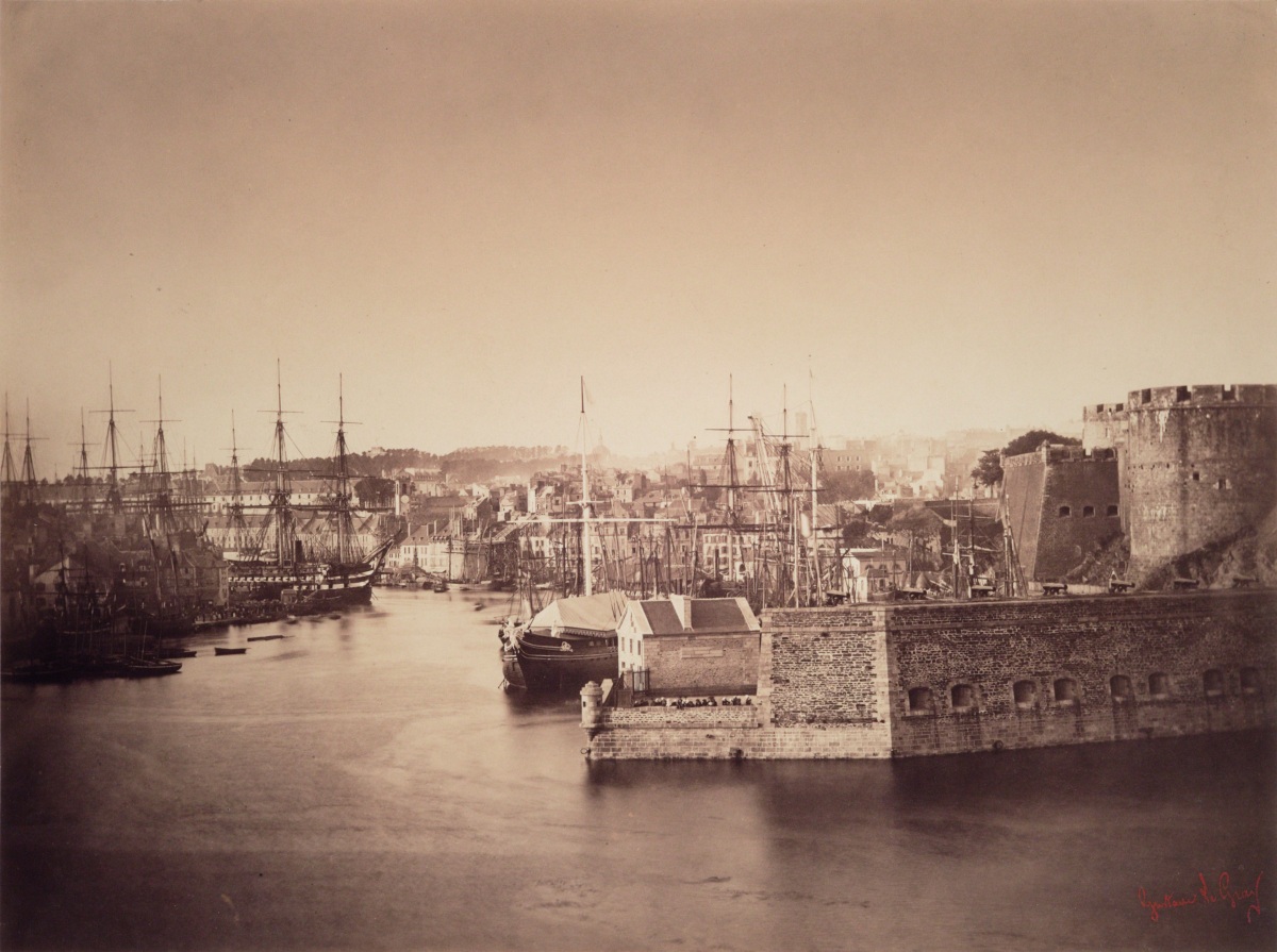 On remarque quici Gustave Le Gray sest rapproché au maximum du sujet pour donner force et majesté à lentrée du port. Dans cette photographie, notons la présence à quai dimportants navires similaires à ceux représentés dans les vues de Cherbourg. On remarque également, sur la droite, un bateau richement décoré et couvert dun dais. On retrouve ce même bateau dans le tableau dAuguste Mayer, réalisé en 1859, intitulé « Visite de Napoléon III à Brest le 11 août 1858(1) ». On observe au premier plan, dans la partie basse des fortifications, une vingtaine de personnes en tenue traditionnelle (chapeaux ronds et coiffes blanches). À loccasion de son voyage à Brest, Napoléon III rencontra des délégations bretonnes.